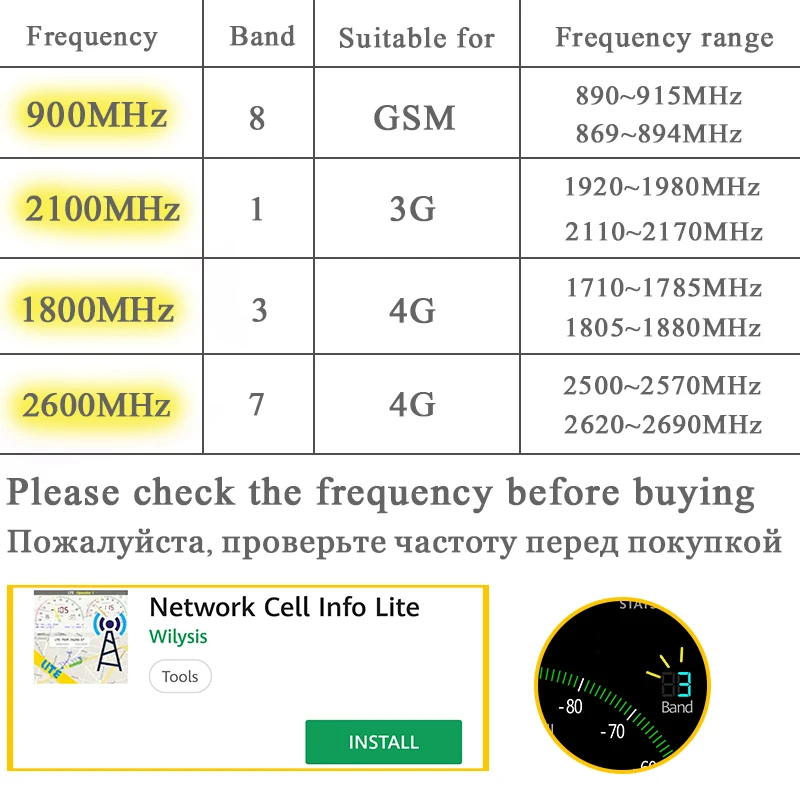 Обратите внимание: это однодиапазонный усилитель сигнала. Чтобы предотвратить покупку неправильного продукта, загрузите приложение: Netwoek Cell Info Lite, чтобы проверить частоту.