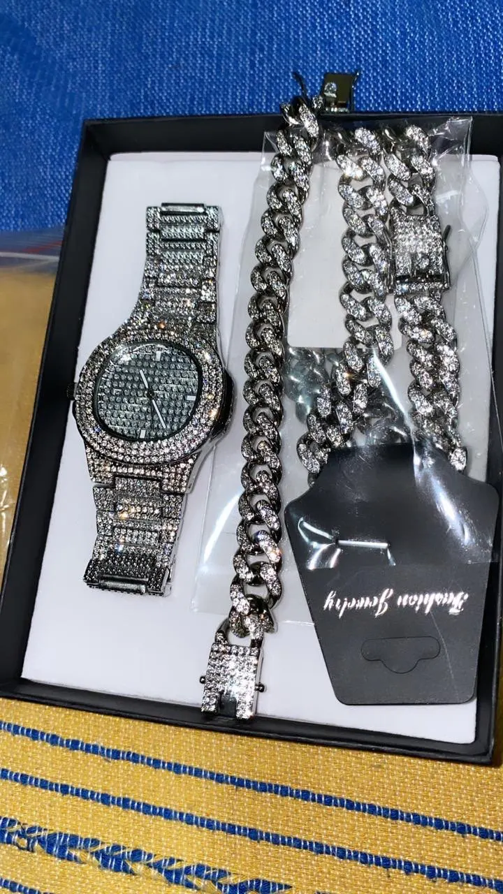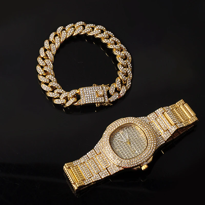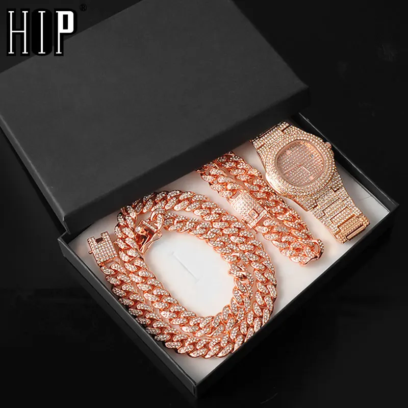 Цепочка мужская из кубинской панцирной цепи Майами, серебристого цвета, ожерелье, часы, браслет в стиле хип-хоп, сверкающие стразы с фианитами