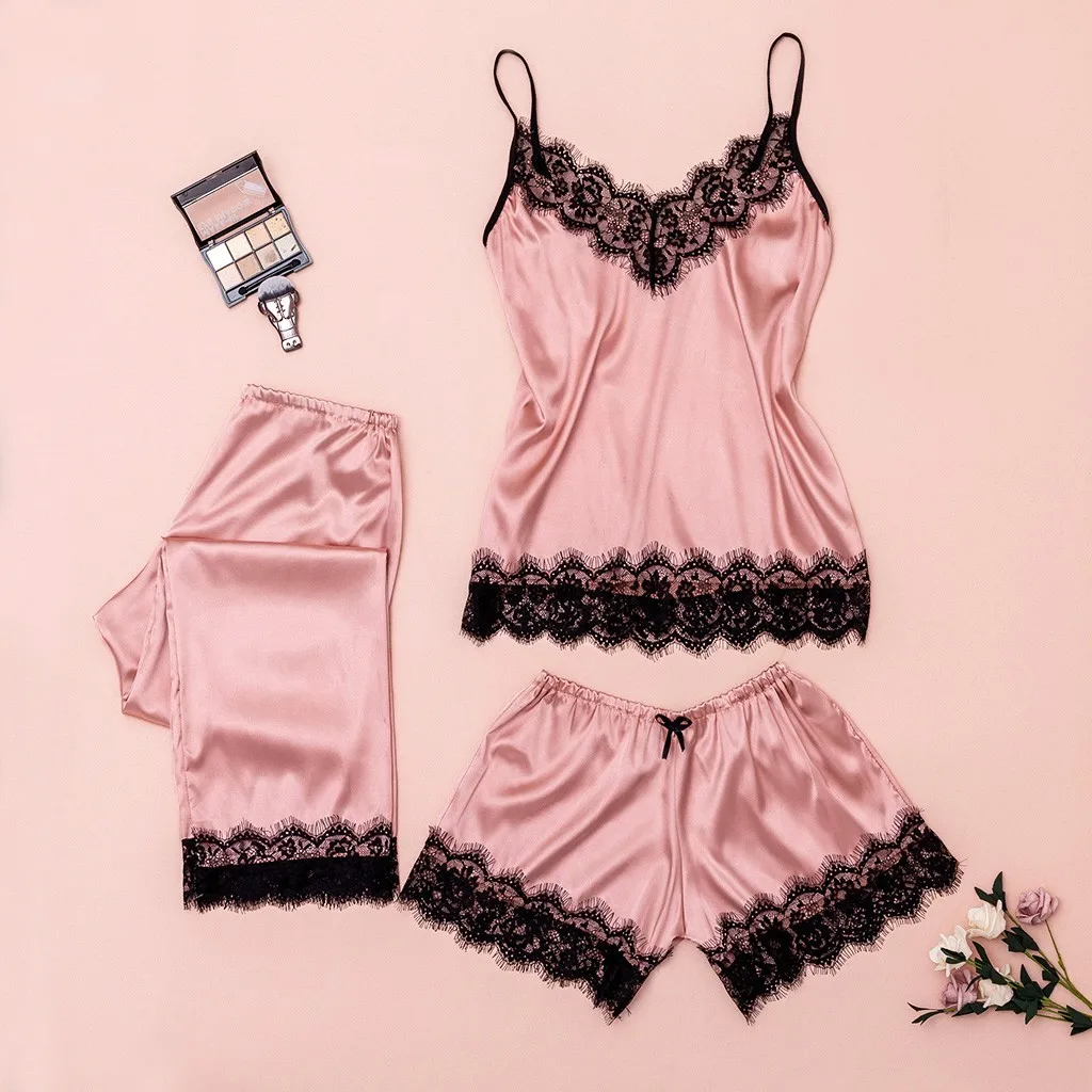 Женский пижамный комплект из 3 предметов, модная кружевная атласная...