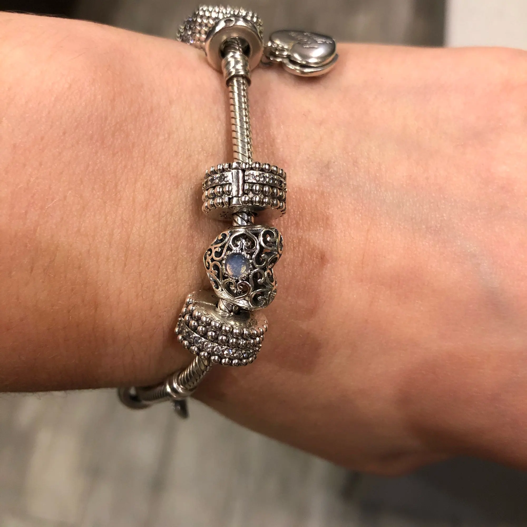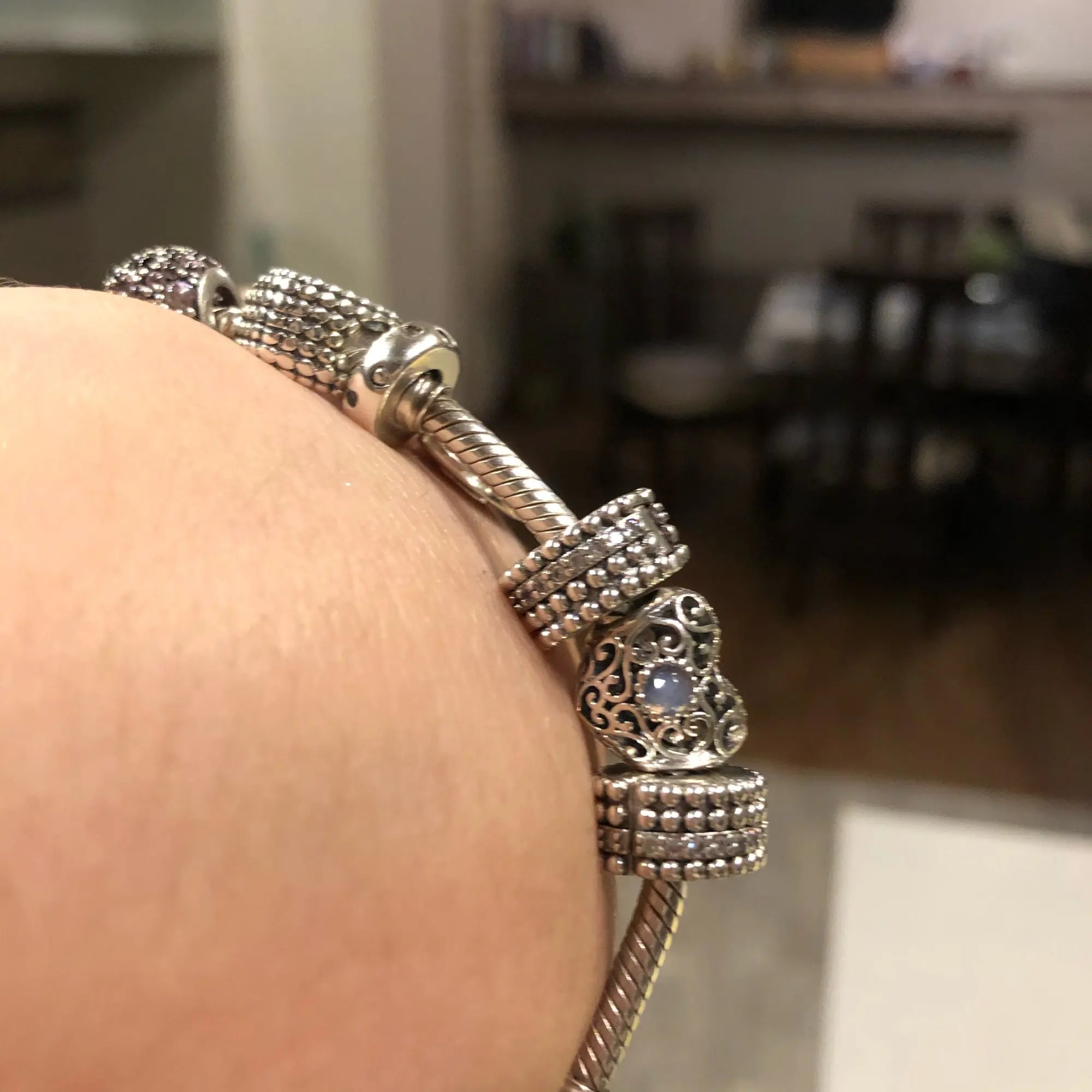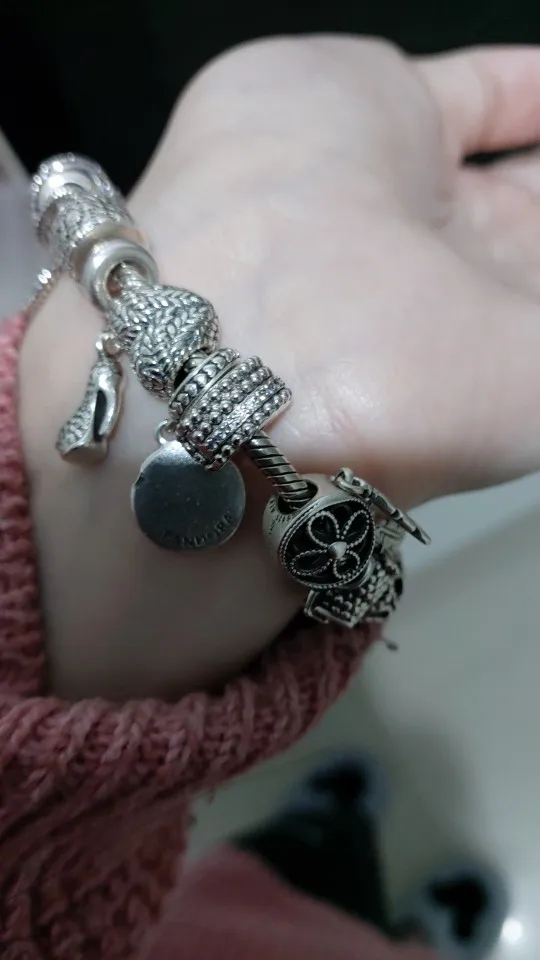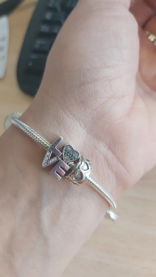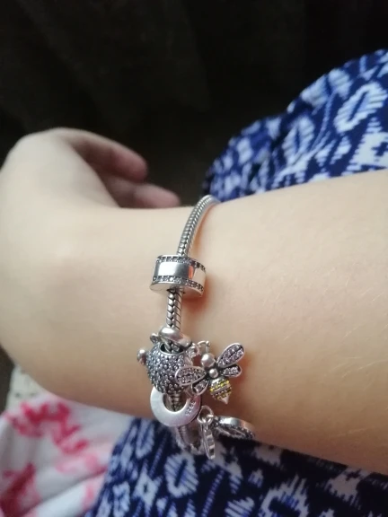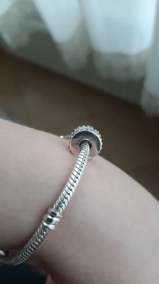 Очень красиво! Лучше, чем я ожидал. Хорошее качество. Посмотрите, не окисляется ли время... зажим не закреплен в какой-либо части браслета Pandora, но в конкретных частях, которые существуют в самом браслете, которые более толстые. Эти детали, они прочно и без опасности, или другие Подвески упадут, чтобы открыть их, чтобы взять или положить, если вы поставите в конец браслета. Рекомендуем!