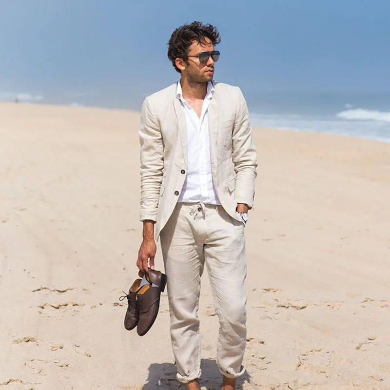 ANNIEBRITNEY Beige 2 Piece Men Slim Fit Business Linen
