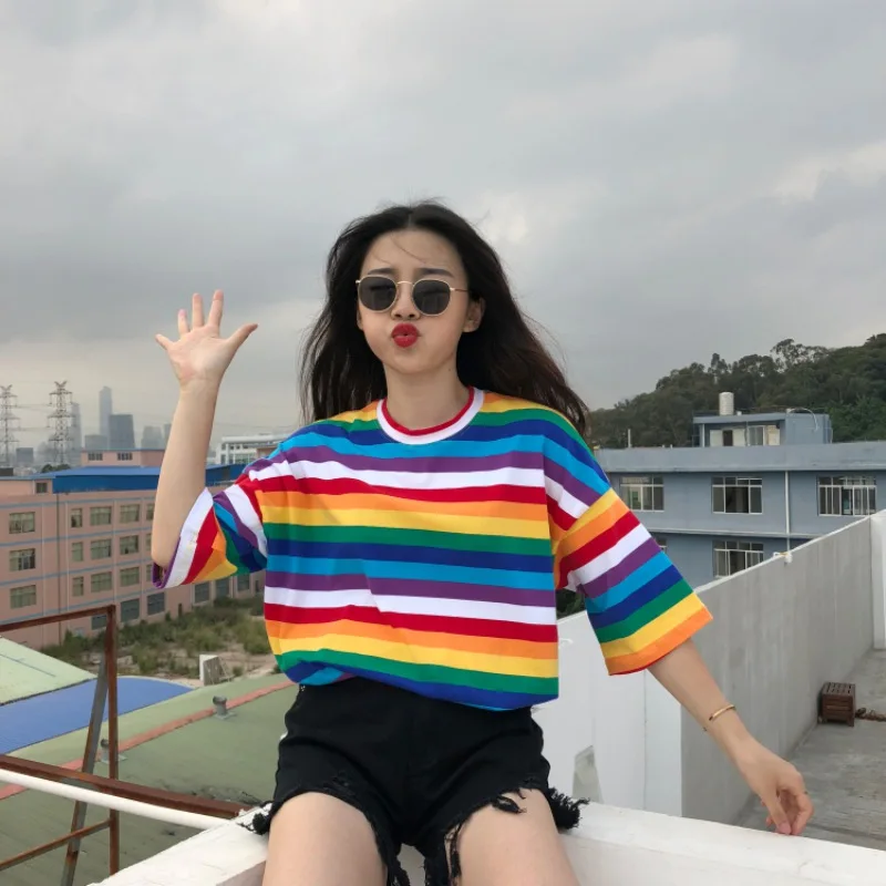 2020 летняя новая женская футболка Harajuku, женская футболка в радужную полоску, модная Корейская версия длинных футболок с короткими рукавами