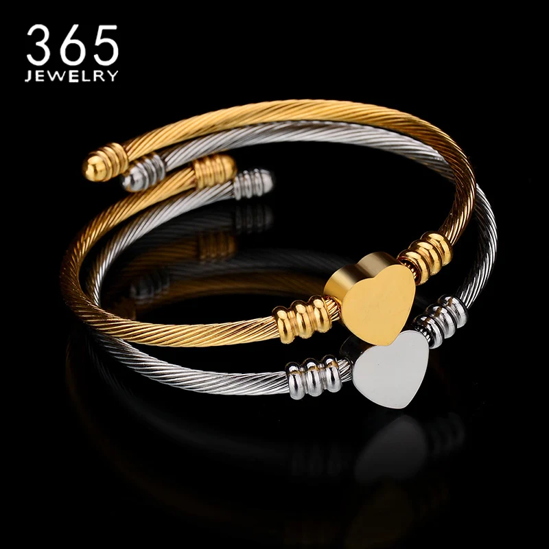 Модный золотистый Браслет-манжета из нержавеющей стали, украшенный витой проволокой, браслет с подвеской в форме сердца для женщин и девушек, свадебная бижутерия, подарок