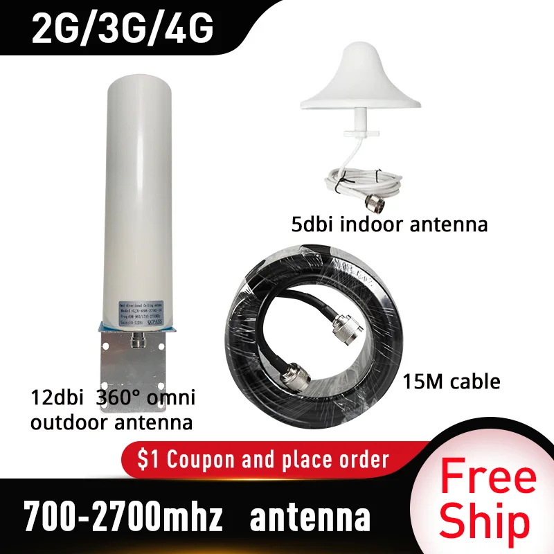 2G 3G 4G антенна 700 ~ 2700mhz LPDA усиление 12dbi omni наружная антенна усилитель мобильного сигнала потолочная Внутренняя антенна Аксессуары Упаковка включает: 1. 12dbi 360 ° omni наружная антенна 2 .. 5dbi внутренняя Omni антенна 3. Кабель 15 метров