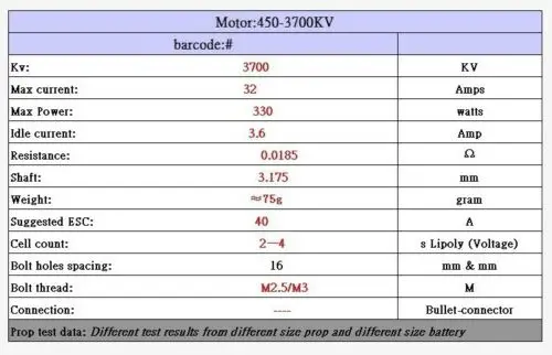 100% Фирменная Новинка! KV: 3700KV Максимальный ток: 32 А Максимальная мощность: 330 Вт Ток холостого хода: 3,6 ампер Сопротивление: 0.0185Ω Вал: 3,175 мм Вес: 75 г Рекомендуемые ESC: 40A Количество ячеек: 2-4S Lipoly (напряжение) Расстояние между отверстиями для болтов: 16 мм и мм Резьба болта: M2.5/M3 Костюм для 450 RC вертолета