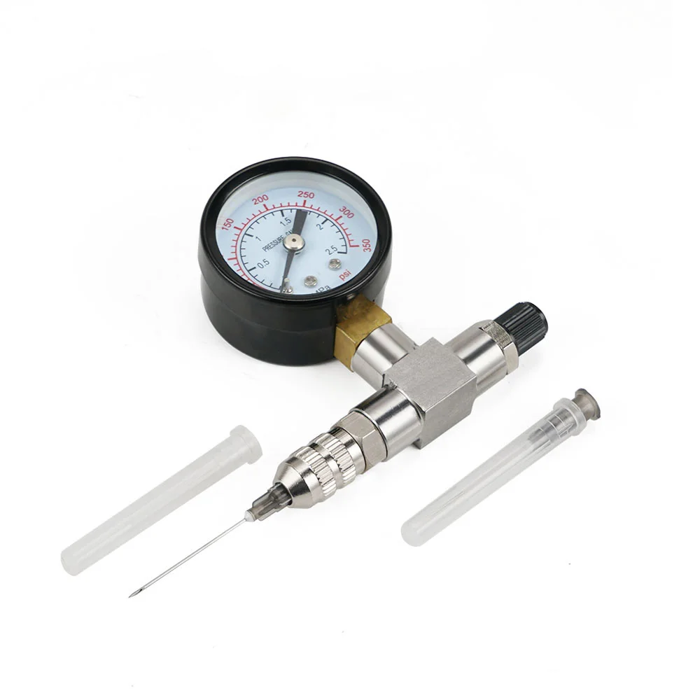 Инструмент для заполнения иглой поставляется с черным манометром 350 PSI и позволит вам подзарядить Давление азота при любых ударах, используя самовосстанавливающуюся резиновую пробку.