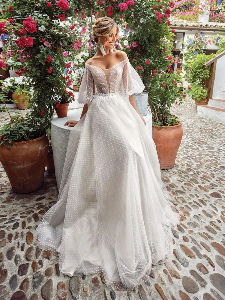 Винтажное дизайнерское фатиновое свадебное платье в горошек с открытыми плечами, полупышные рукава, романтичные Свадебные платья 2020, Vestidos De Noiva