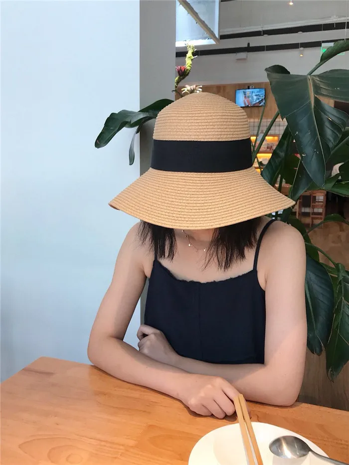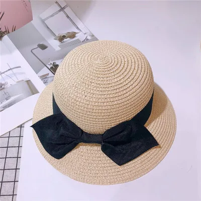 Шляпка для детей и родителей, женская Соломенная Панама с черной лентой, украшенная лентой, для девочек, детская шапка от солнца, детская пляжная шляпка