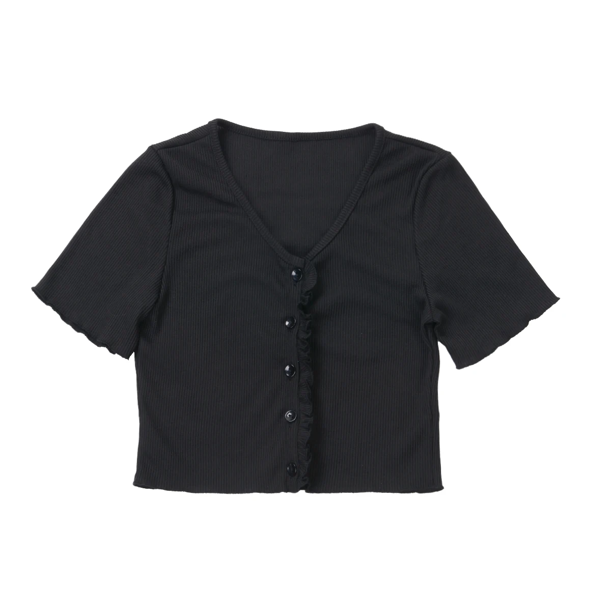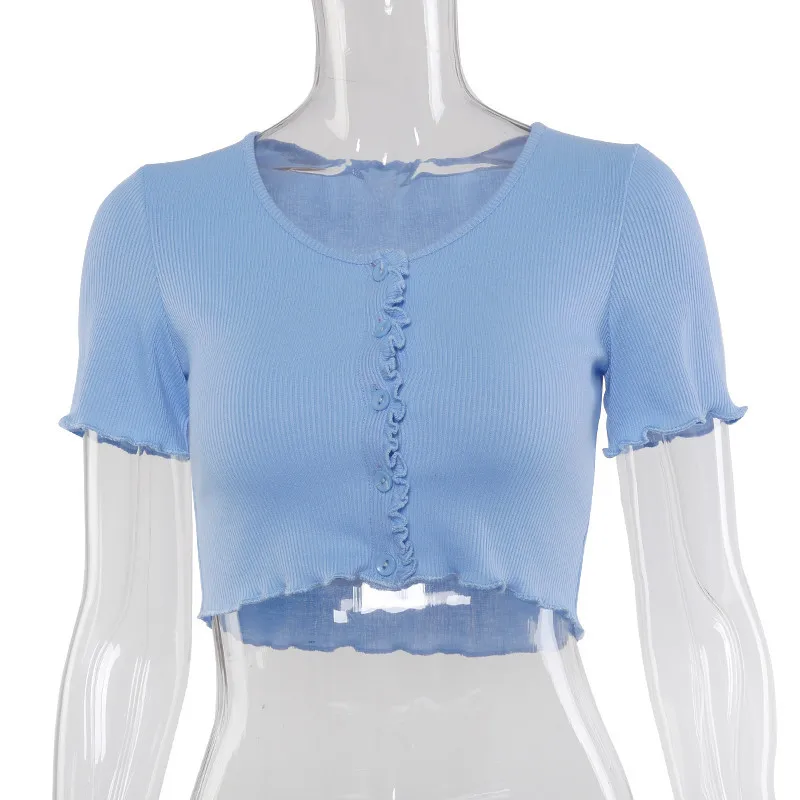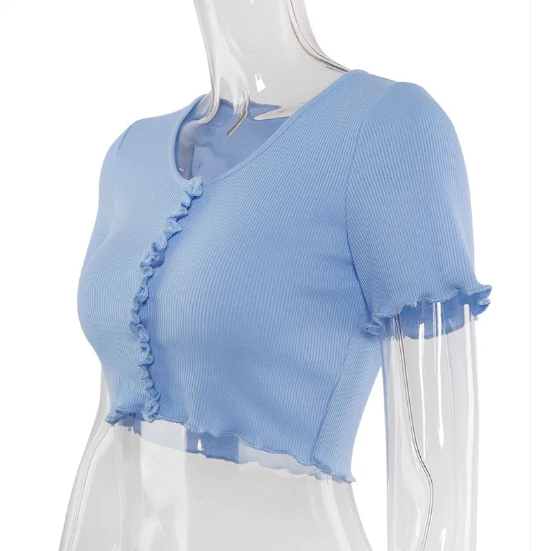 2020 Сексуальная женская футболка с v-образным вырезом и коротким рукавом, футболка с оборкой, Клубная одежда на пуговицах, облегающая Однотонная футболка, укороченный топ, летняя верхняя одежда, Прямая поставка
