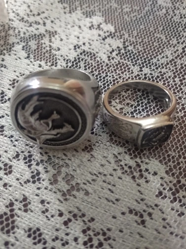 «Черные» области, показанные на картинке, совсем не выглядят черными. Все изделие выглядит очень серебристым. У меня был металлический кусок, который мне пришлось выкопать из волка с помощью отвертки, но теперь он выглядит нормально. Это большое кольцо. Быстрая доставка.