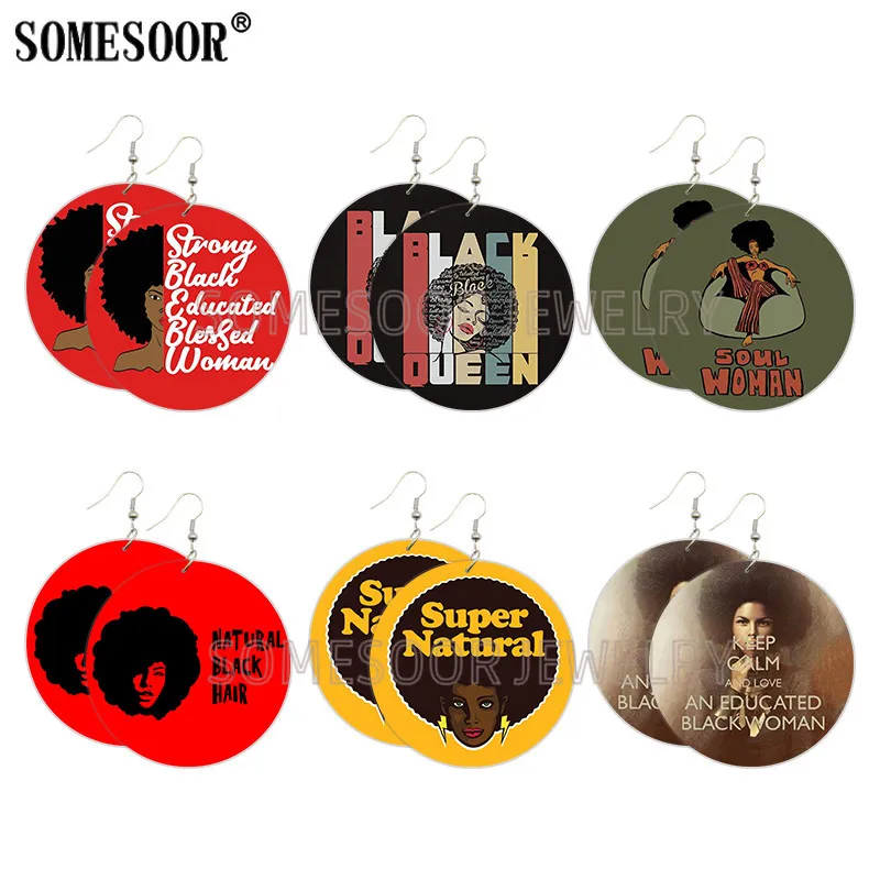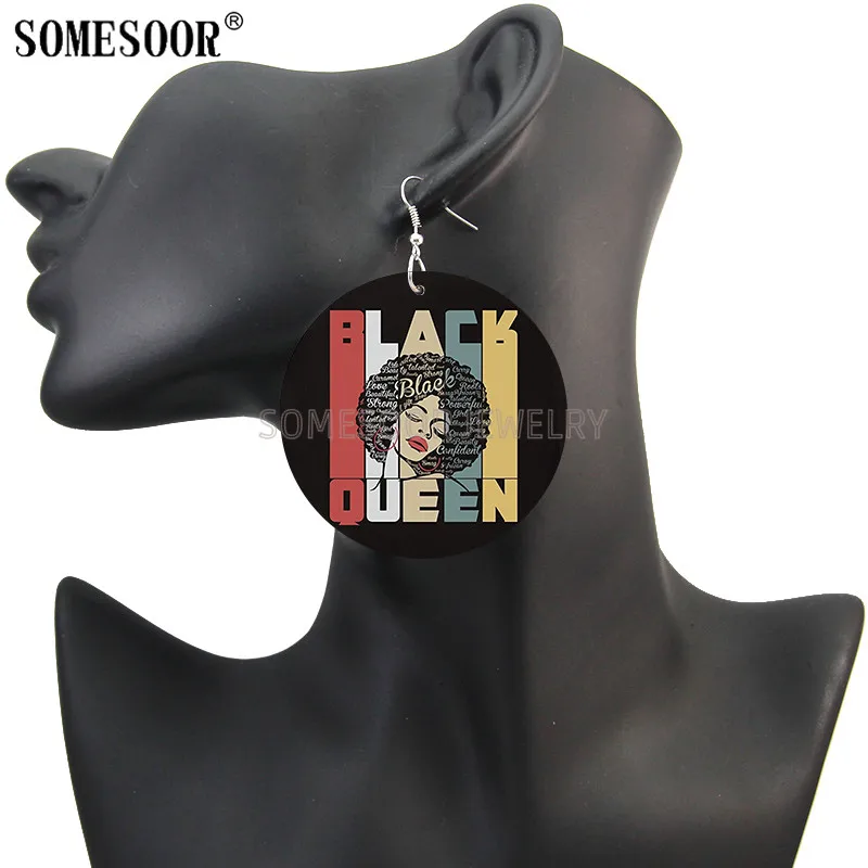 SOMESOOR супер натуральная Черная Королева африканские деревянные висячие серьги образованная благословная душа женщины с обеих сторон печатные деревянные Уши висячие
