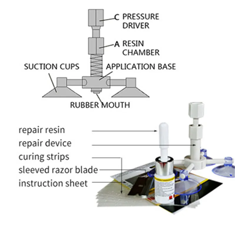• Этот набор следует использовать только для глаз быка, паутины, повреждений звезды, а некоторые комбинации разбиваются на 1 дюйм (25 мм) в диаметре. Этот комплект не будет ремонтовать поверхностные ямы больше, чем или