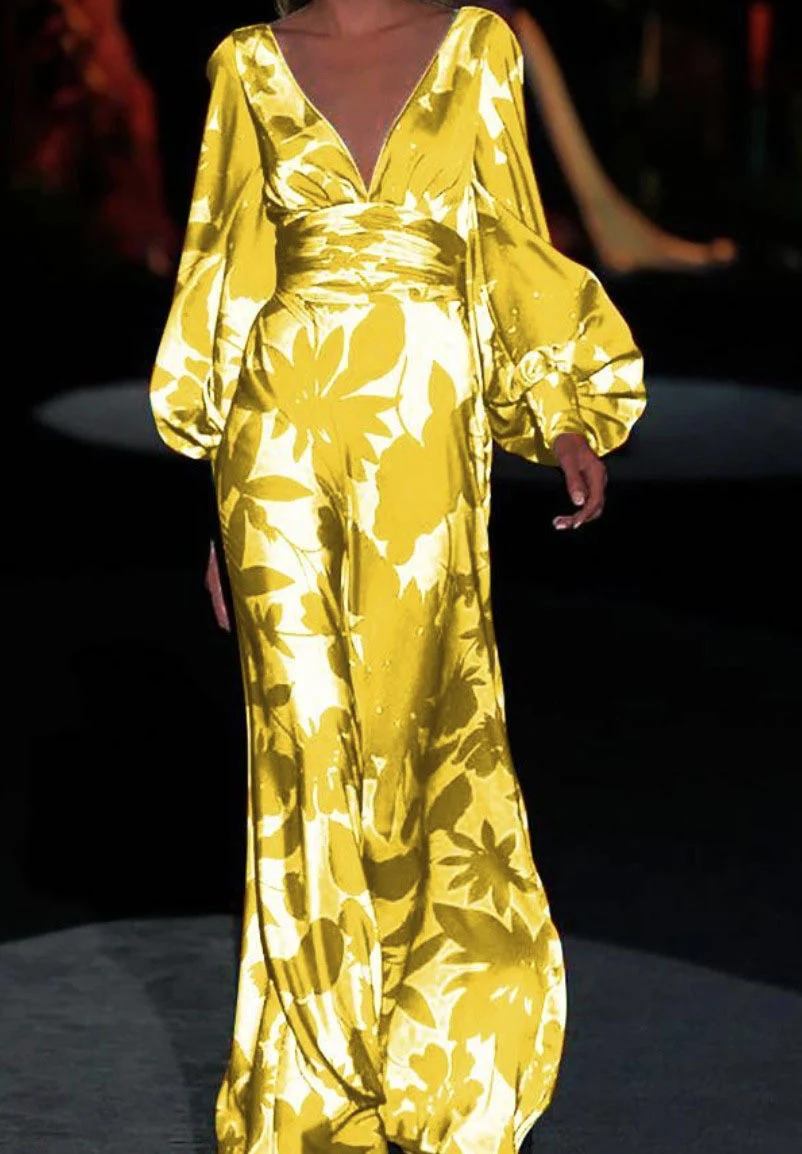 Платье-макси с длинным рукавом-фонариком и V-образным вырезом