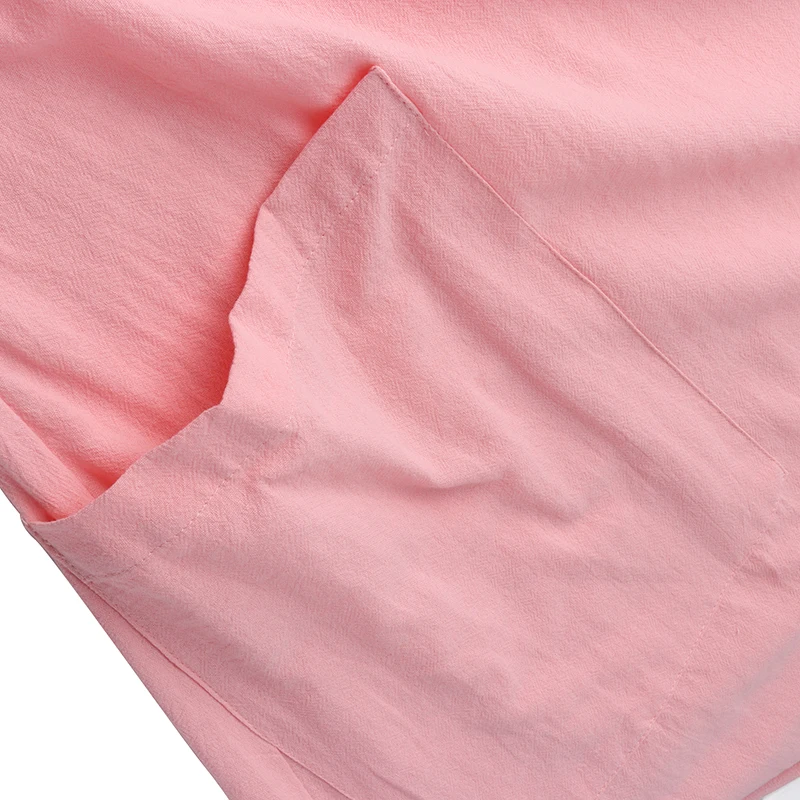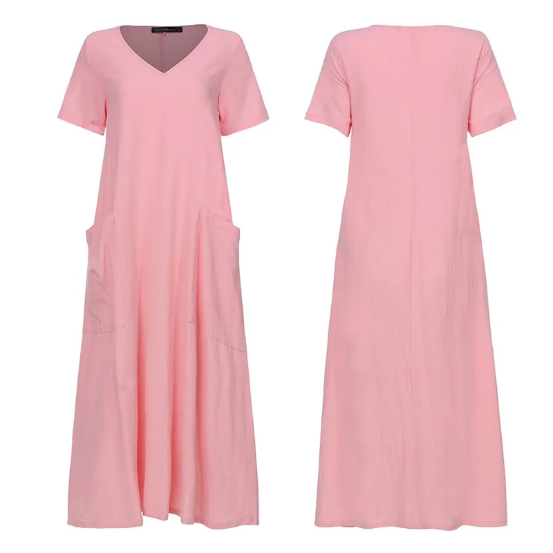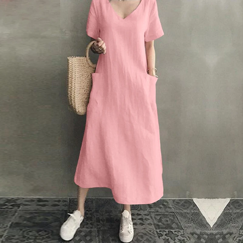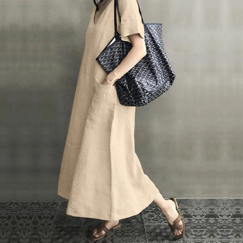 Женское однотонное платье макси, винтажный сарафан из хлопка и льна с коротким рукавом и V-образным вырезом, лето 2021