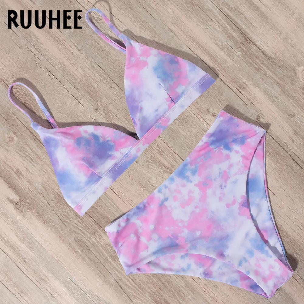 Купальник бикини RUUHEE Женский, однотонный купальный костюм с принтом тай-дай, с подушечками, пляжная одежда с завышенной талией, 2021