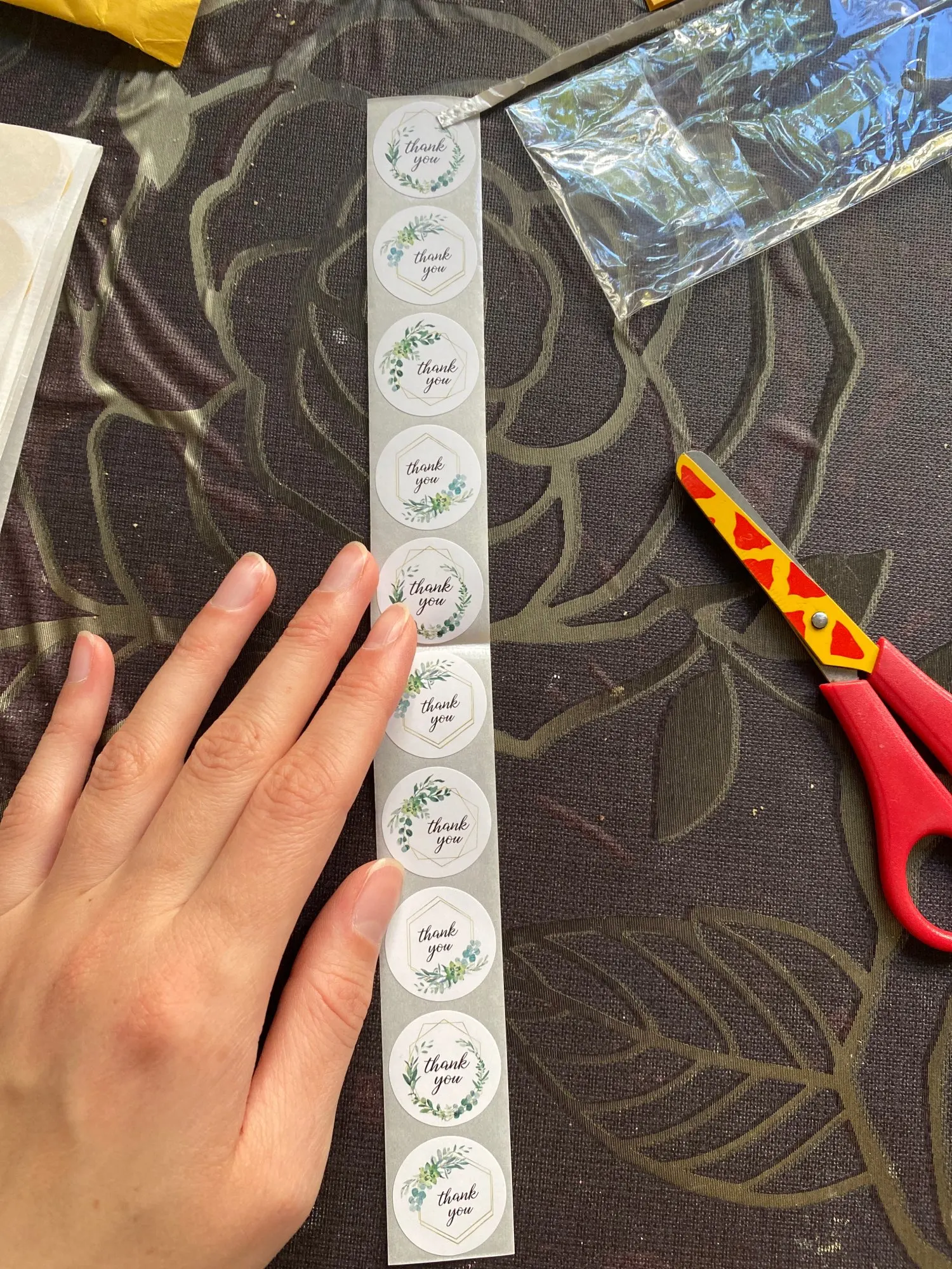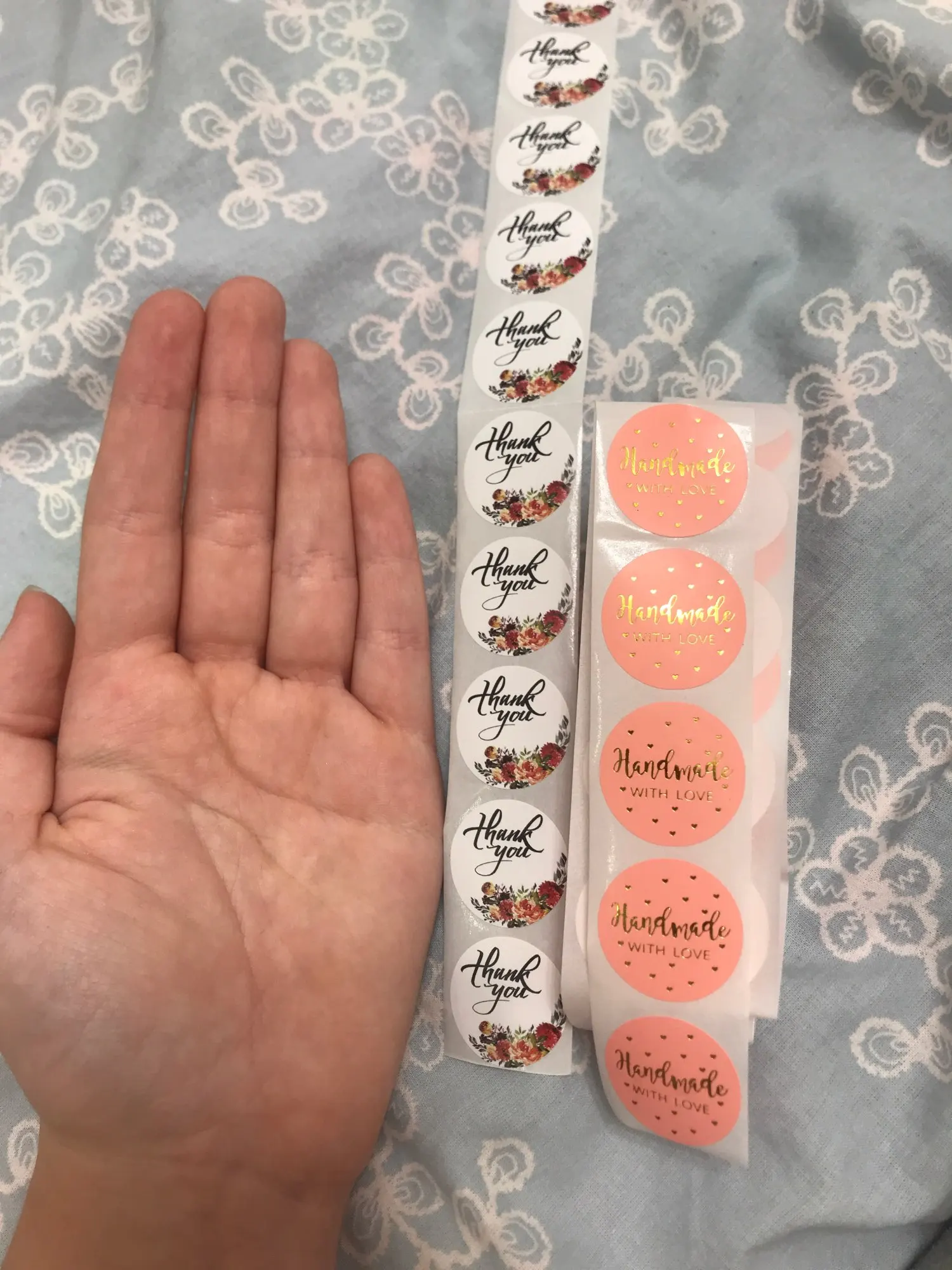 Продавец по моей просьбе отправил товар в тот же день, когда я его оплатила, посылка пришла очень быстро - всего за неделю. Каждый набор наклеек в индивидуальном пакете, а вся посылка в пупырчатом почтовом пакете. Во время транспортировки ничего не помялось. Сами наклейки небольшие, для сравнения положила рядом монету 2₽, я ожидала что они будут побольше, но несмотря на небольшой размер я все равно довольна, так как они мне подходят. В подарок продавец положил ленту из десяти мылых наклеек «Thank you “, спасибо. Продавца рекомендую, ответил быстро и приложил усилия чтобы удовлетворить мою просьбу о скорейшей отправки. Товар тоже рекомендую, качество хорошее.