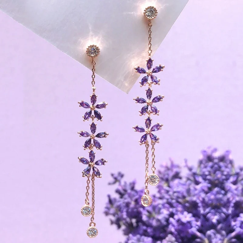 Женские длинные висячие серьги, корейские элегантные вечерние серьги с фиолетовыми цветками, кристаллами и кисточками, подарочные украшения