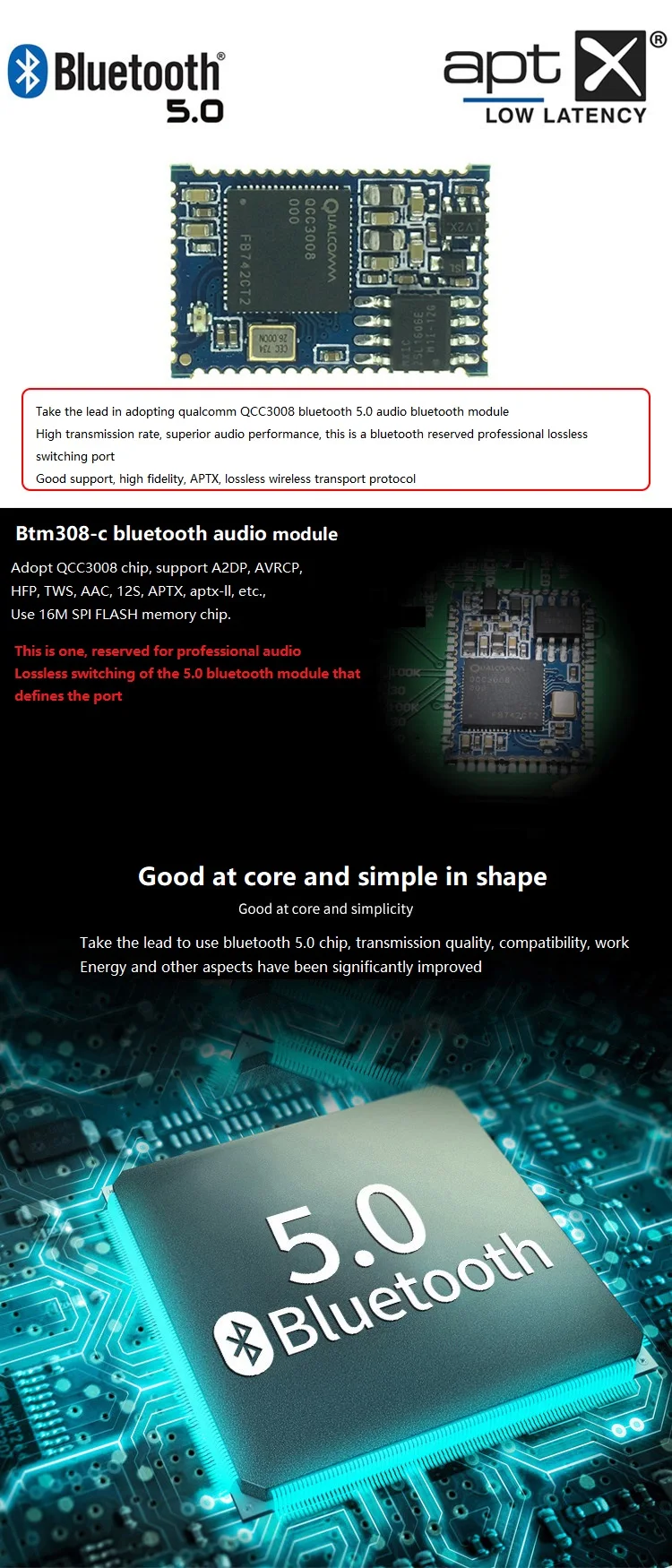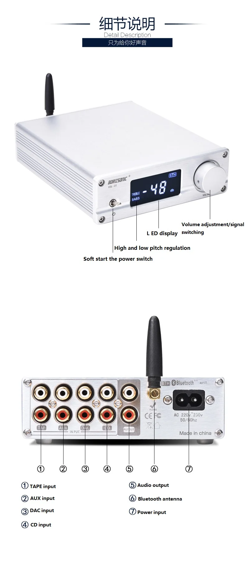 4 + 1 канальная передача без потерь, удаленный объемный предусилитель. Используйте аудиомодуль QCC3008 Bluetooth 5,0. Поддержка A2DP, AVRCP, HFP, TWS, AAC, I2S, APTX, APTX-LL и т. д., с использованием чипа флэш-памяти SPI 16M. Используйте японский полностью цифровой регулятор громкости JRC-NJW1194. Используйте двухъядерный инструкционный микропроцессор UK ARM-STM. Используйте японские позолоченные контакты OMRON audio переключатель сигналов. Используйте пользовательский полный источник питания линейного привода. Используйте светодиодный дисплей высокой четкости. С дистанционным управлением. Совместимость с различным аудиооборудованием: Идеально подходит для плееров, декодеров, AV-машин, CD-плееров и других входных и выходных сигналов красного и белого интерфейса RCA. Его также можно использовать с цифровыми продуктами, такими как телевизоры, приставки, MP3s и компьютеры. Как использовать функциональную клавишу (M): Выбор сигнала ---- непрерывное нажатие ручки может переключать режим входного сигнала Регулировка громкости ---- ручка вращается против часовой стрелки "-", ручка вращается по часовой стрелке "+" Регулировка тона ---- долгое нажатие на ручку: ① «Высокие» мигают в нижнем левом углу экрана, а ручку можно отрегулировать до диапазона ± 10 дБ. ② Нажмите кнопку еще раз, чтобы отобразить мигание «басов», и ручка может вращать низкую частоту для регулировки диапазона ± 10 дБ. ③ После завершения регулировки нажмите и удерживайте ручку для экономии.