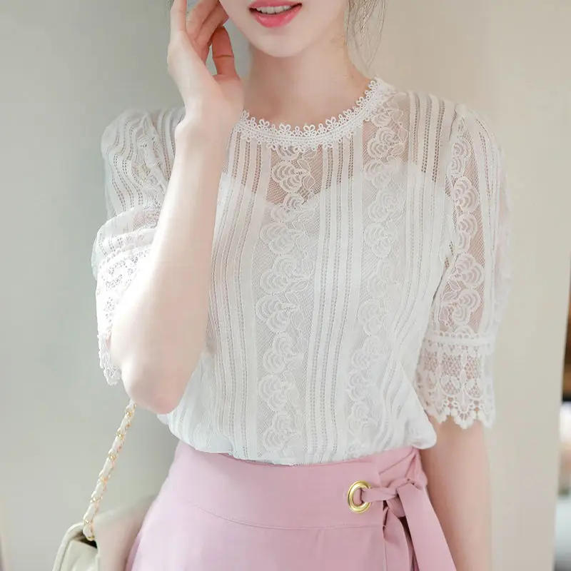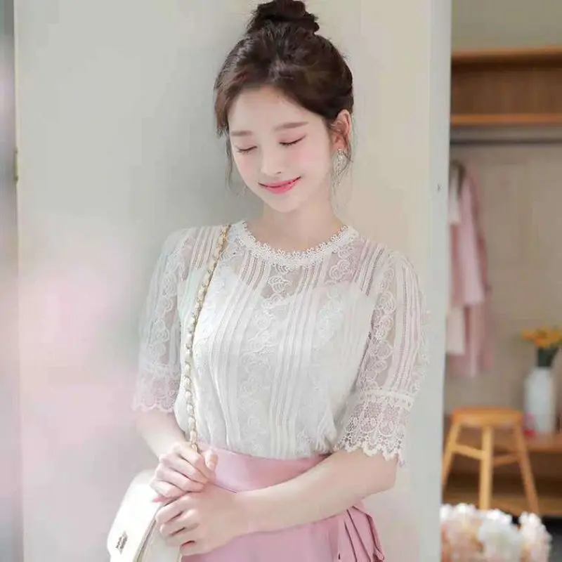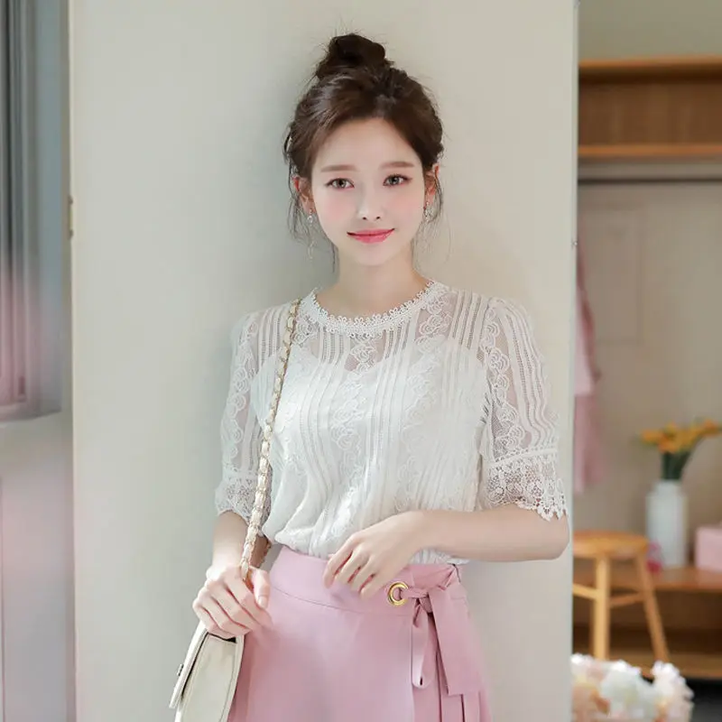 Женская весенне-летняя стильная кружевная блузка, Женская однотонная ажурная блузка с круглым вырезом и рукавом до локтя, элегантные темпераментные Топы DD8625
