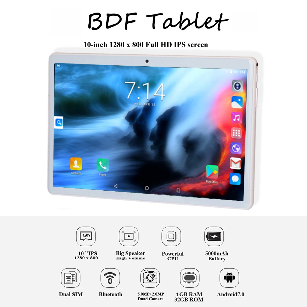 Основная информация: * Марка планшетного ПК: BDF * Размер экрана: 10,1 дюйма * ПЗУ: 4 Гб + 64 ГБ * Разрешение: 1280*800 IPS * Операционная система: Android 9,0 * Процессор ЦПУ: материнская плата MTK Tank * Стандартная Емкость аккумулятора: 5000 мАч Сети и беспроводные: * Wi-Fi: Поддержка Wi-Fi (встроенная карта WLAN 802.11b/G/N) * 3G: встроенный, поддержка 3G звонков, WCDMA 850/2100 МГц * 2G: Поддержка вызовов 2G, GSM 850/900/1800/1900 МГц * SIM-карта: Поддержка * Bluetooth: Поддержка * GPS: поддержка Дополнительные функции: * Камера: фронтальная камера Мп; Задняя камера МП * Входные/выходные порты: -Аудиовыход 3,5 мм * 1; -Порт Micro USB * 1; -Слот для карты Micro TF * 1; -Слот для SIM-карты * 2 * OTG: Да * Устройство вывода: Встроенные громкие динамики * Устройство ввода: Встроенный микрофон * Play Store: Да, встроенный * Android Market: Да, вы можете скачать тысячи приложений с рынка Google Android * Adobe Flash: Поддержка * Языки: африкаанс, индонезийский, малайский, датский, немецкий, английский, испанский, филиппинский, французский, итальянский, магияр, Голландский, Португальский (Бразилия), португальский (Португалия), вьетнамский, турецкий, греческий, русский, арабский, тайский, корейский, китайский (trad), японский и т. Д. Посылка входит: * 1 шт. планшетный ПК * Стандартное зарядное устройство, 1 шт. * 1 руководство пользователя на английском языке
