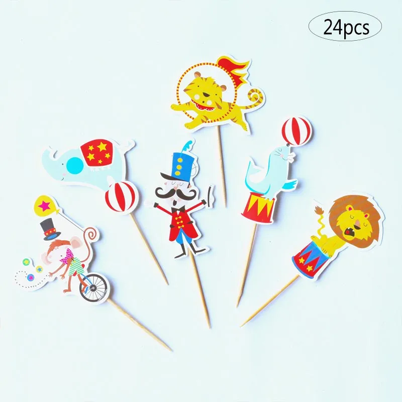 24 шт. цирковые торты, Топпер для клоуна, капкейка, топпер для детского дня рождения, товары для детского дня рождения, топ для торта, флаг, баннер, украшение
