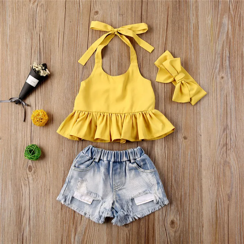От 1 до 6 лет комплекты одежды из 3 предметов для девочек модная летняя одежда для маленьких девочек жилет с рюшами Топ + Рваные джинсовые шорты + головной убор