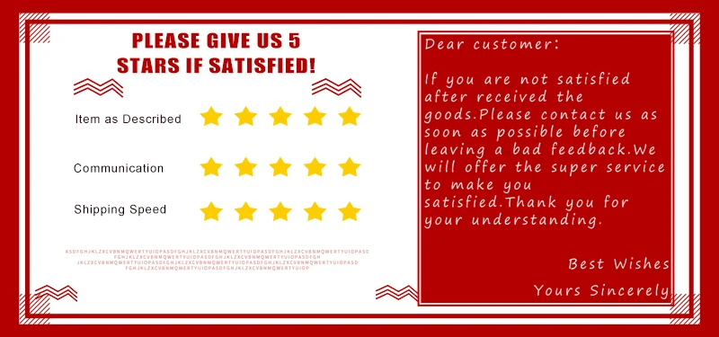 1. Если вы удовлетворены своим заказом, пожалуйста, оставьте нам все 5 звезд, включая товар, как описано.