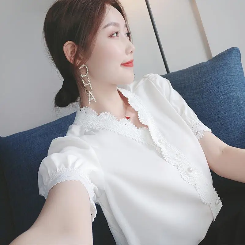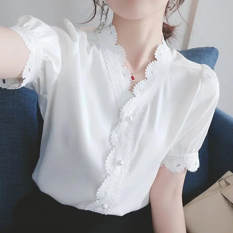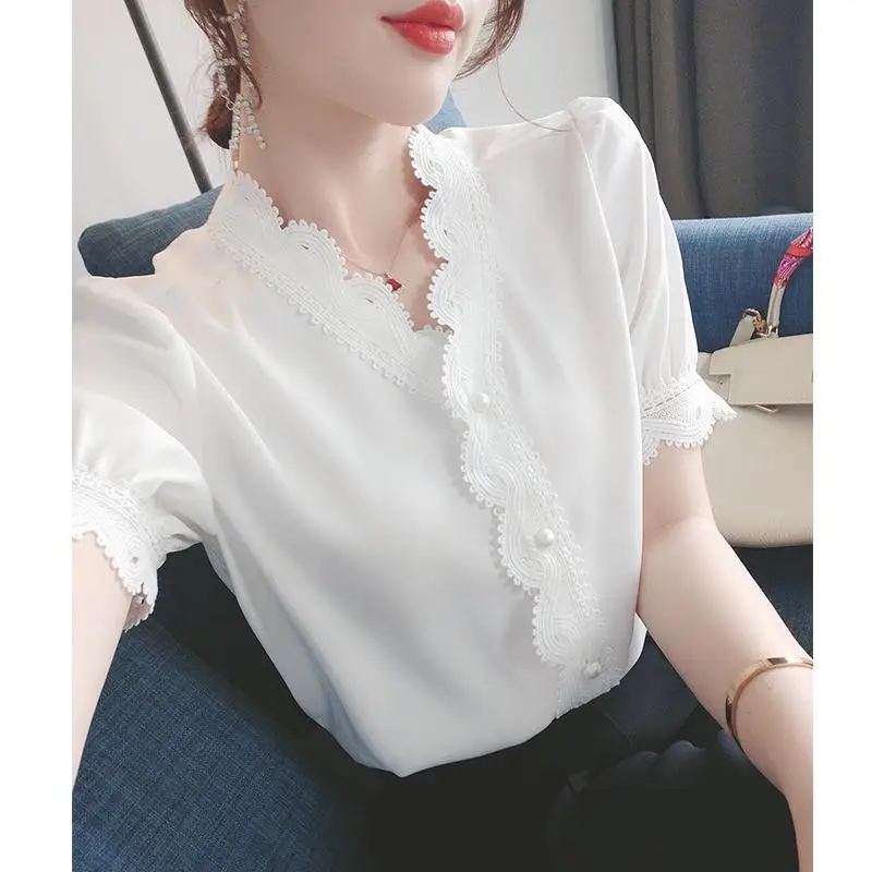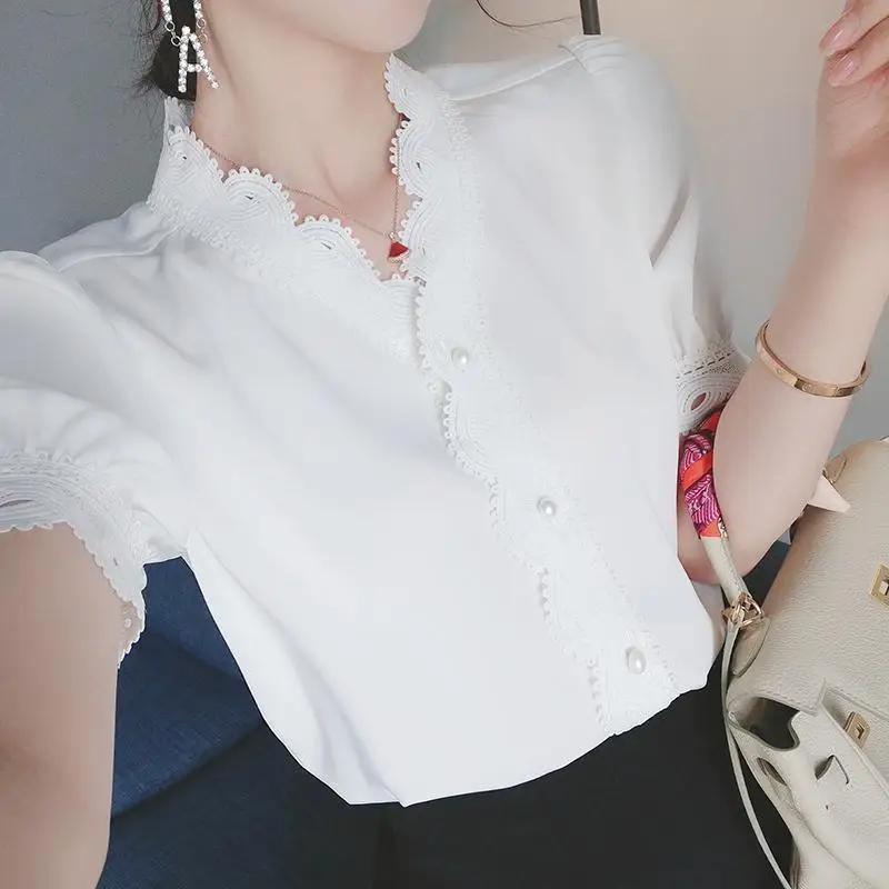 Женская шифоновая блузка, однотонная, на пуговицах, с V-образным вырезом и коротким рукавом, весна-лето, DD8636