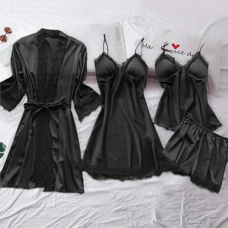 Комплект пижамный Женский, из 4 предметов, атласный, кружевной