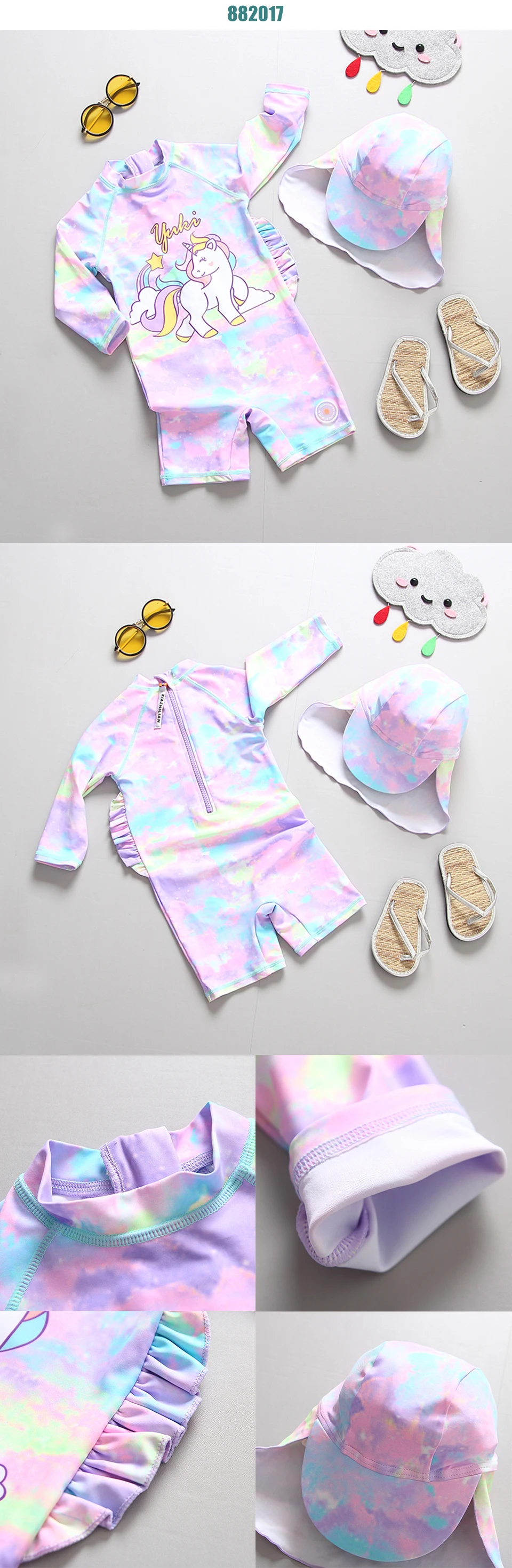 С защитой от солнца UPF 50 + и принтом мультяшного единорога, этот набор Рашгард сохранит ее милой и защищенной весь день.