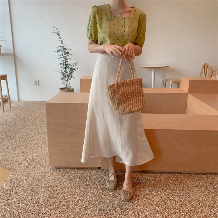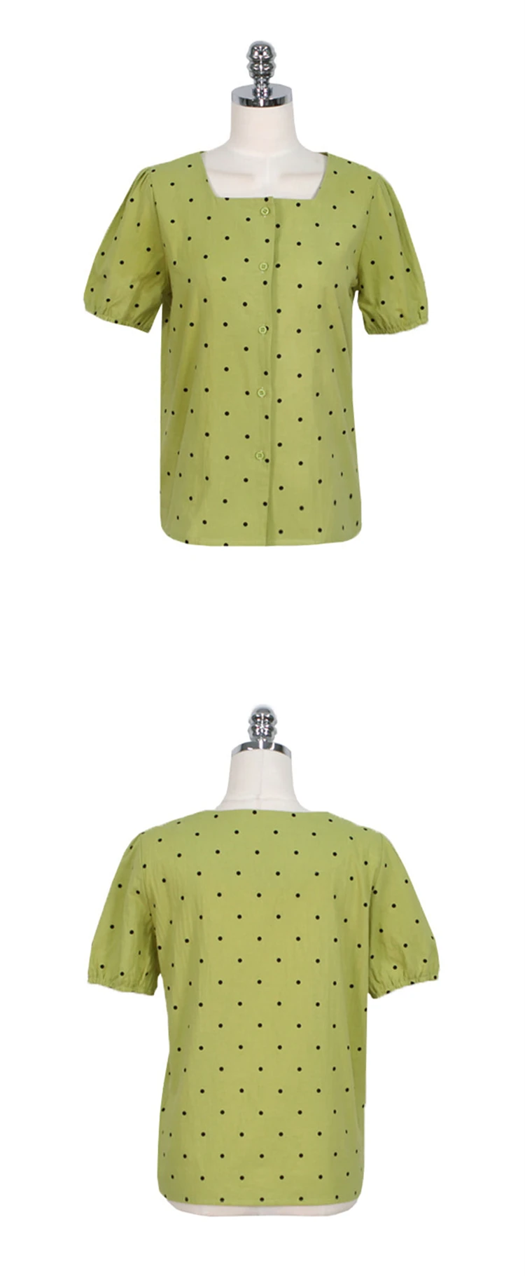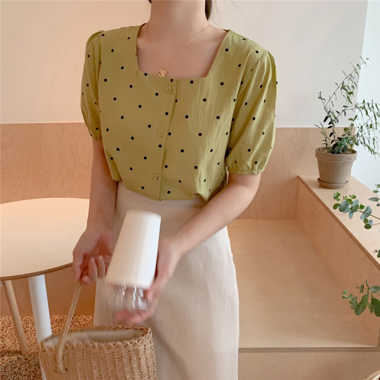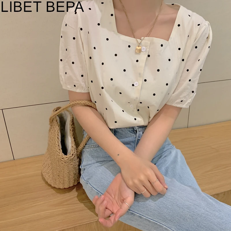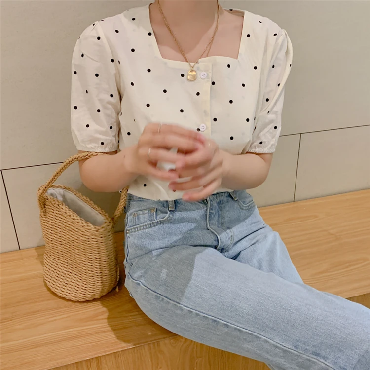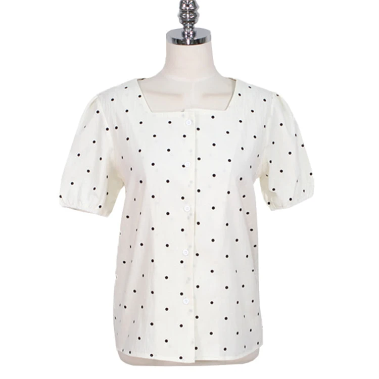 Блузка женская с квадратным вырезом, Повседневная модная однобортная рубашка в горошек, с пышными рукавами, блузка, лето 2021