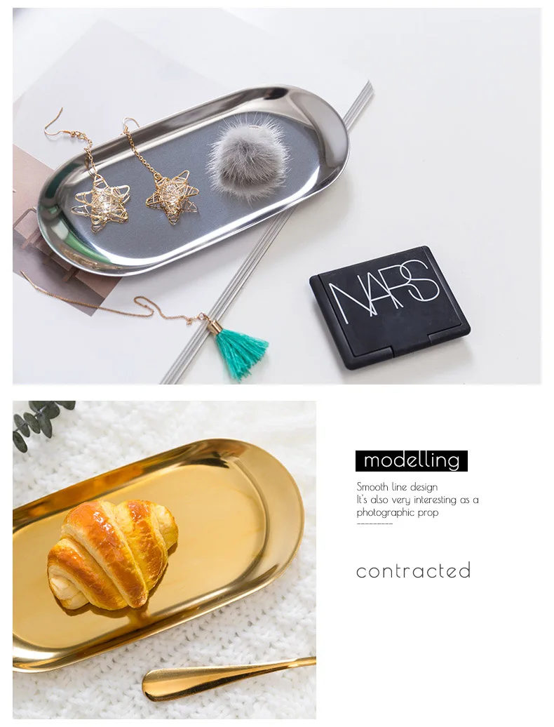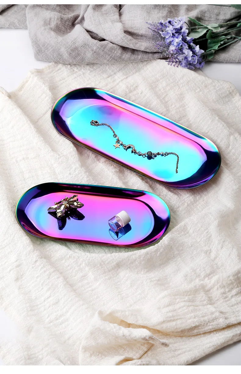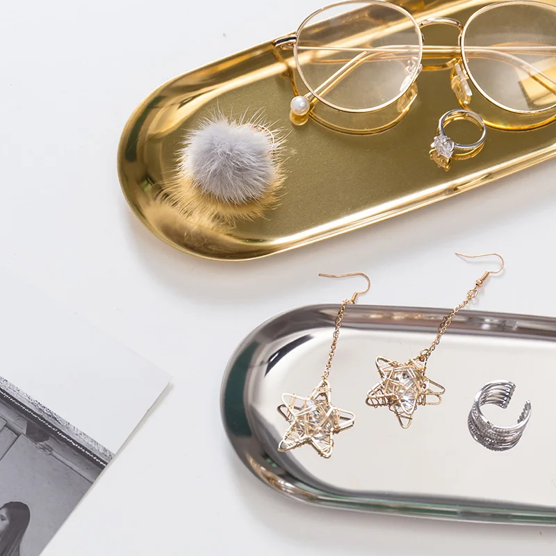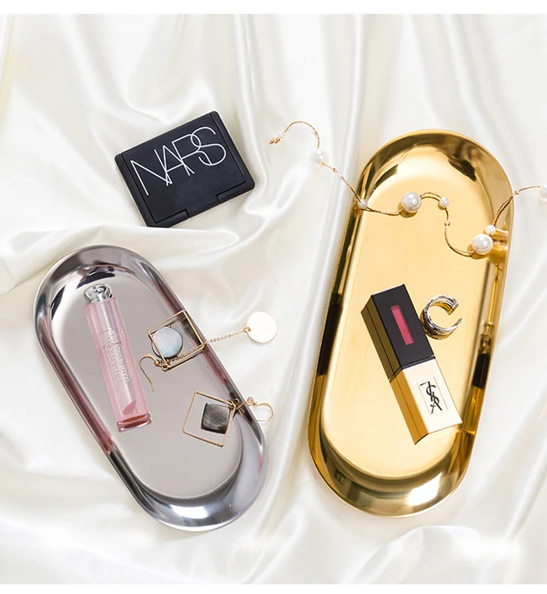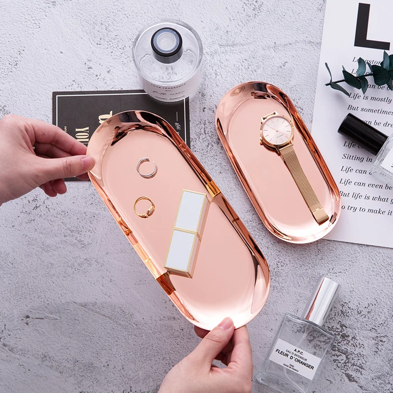 Металлическая тарелка для хранения ювелирных изделий, овальный лоток из нержавеющей стали в современном стиле, декоративный поднос цвета розового золота, серебряный