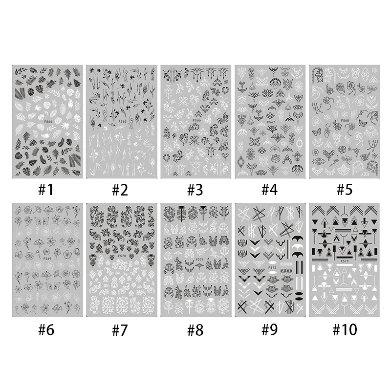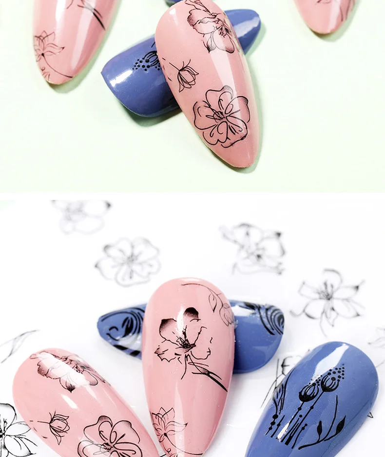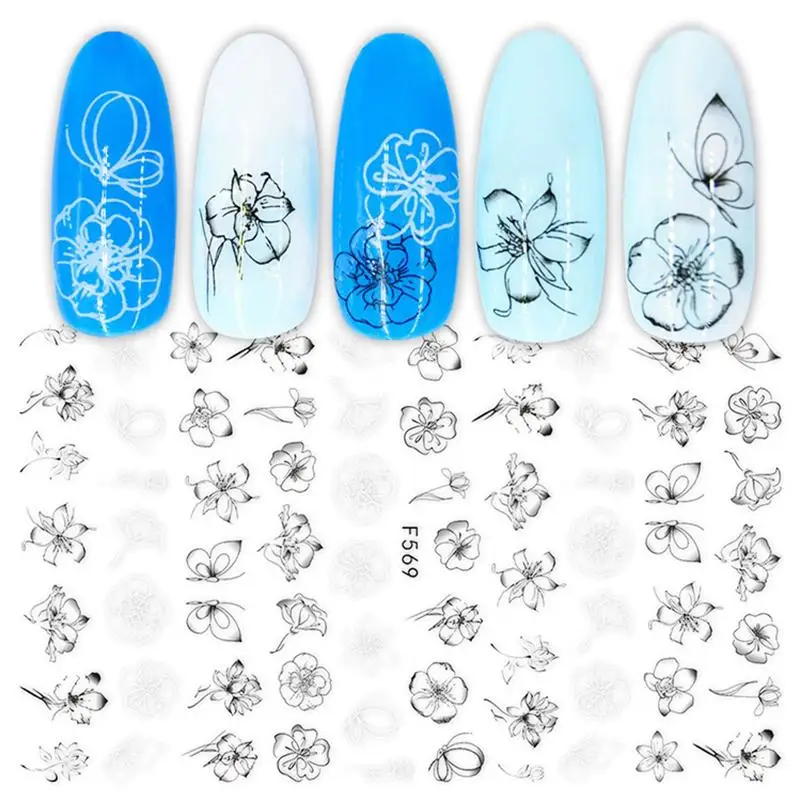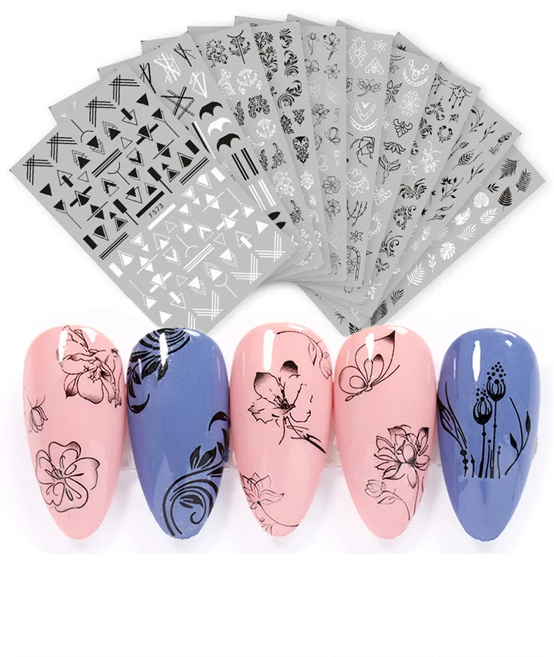 Клейкие стикеры 3D на ногти Nail Art для ногтей, 1 лист, черные и белые, с цветами, листьями, змеей, мандалой, геометрические наклейки