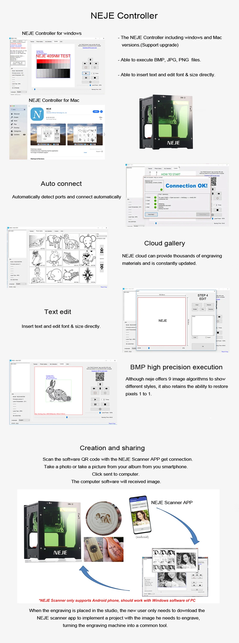 Сканируйте qr-код с помощью приложения NEJE Scanner (только поддержка версии Android), он автоматически подключается к компьютерному программному обеспечению, прост и прост в использовании.
