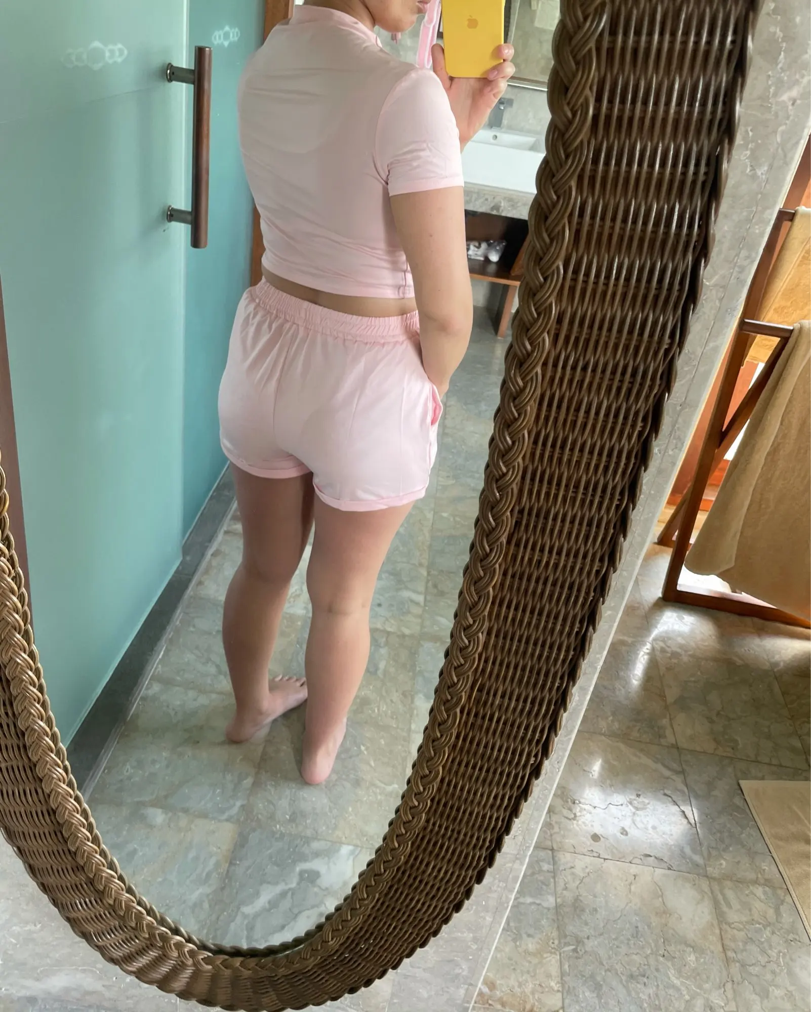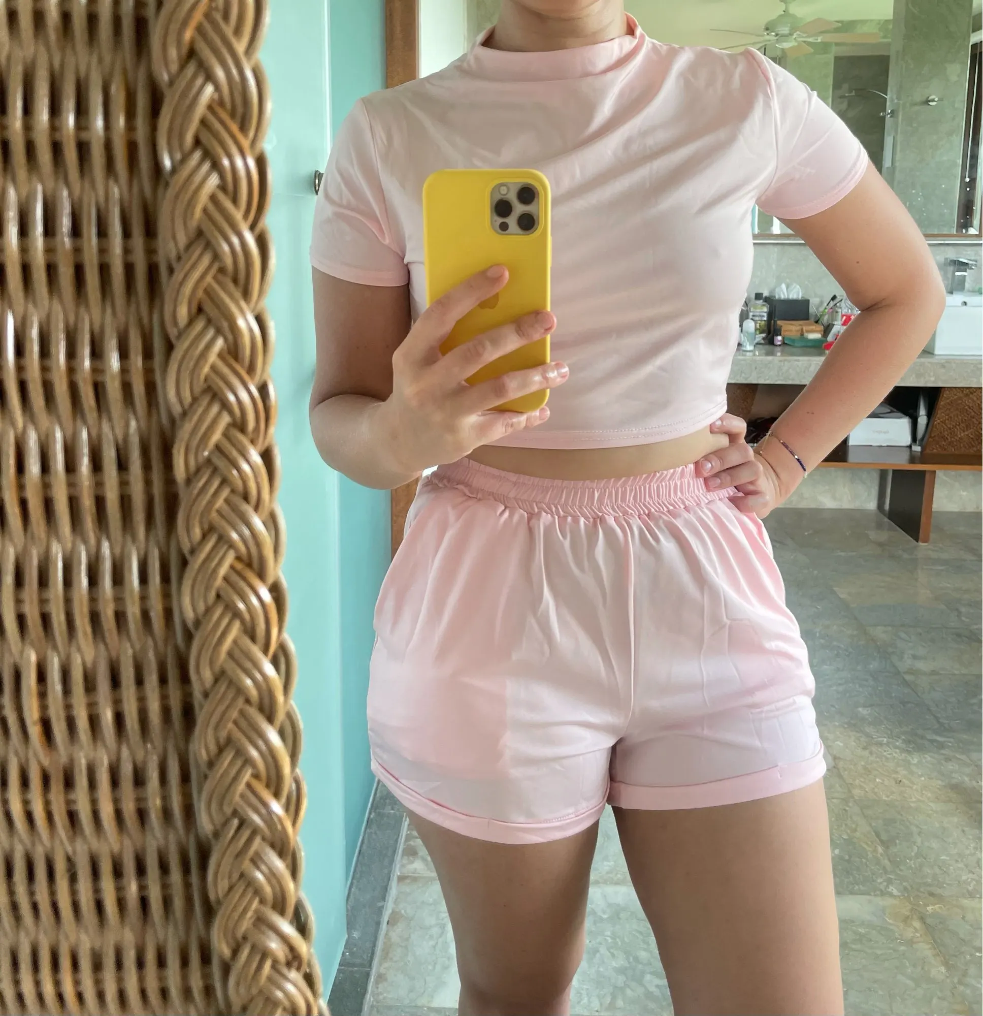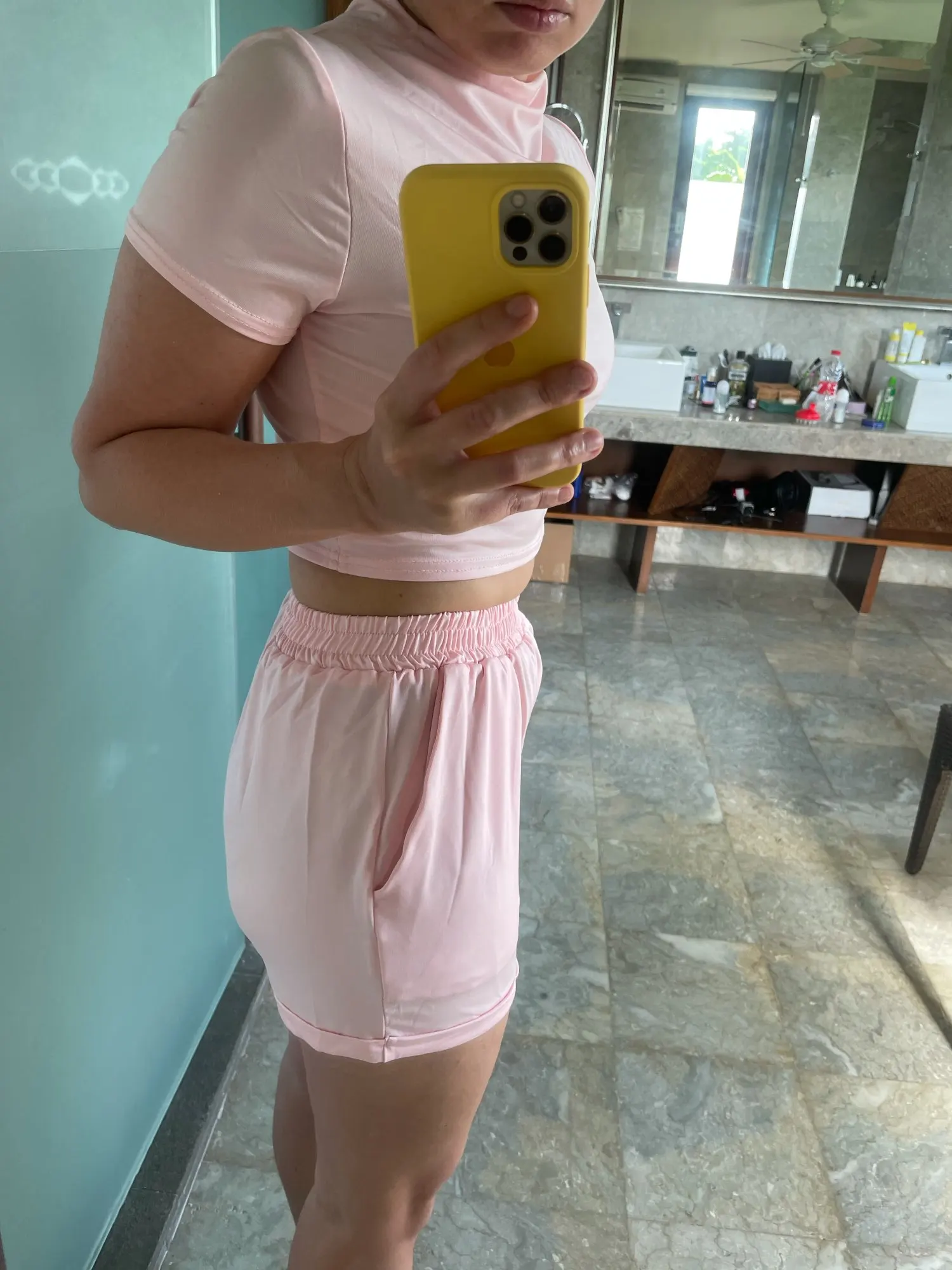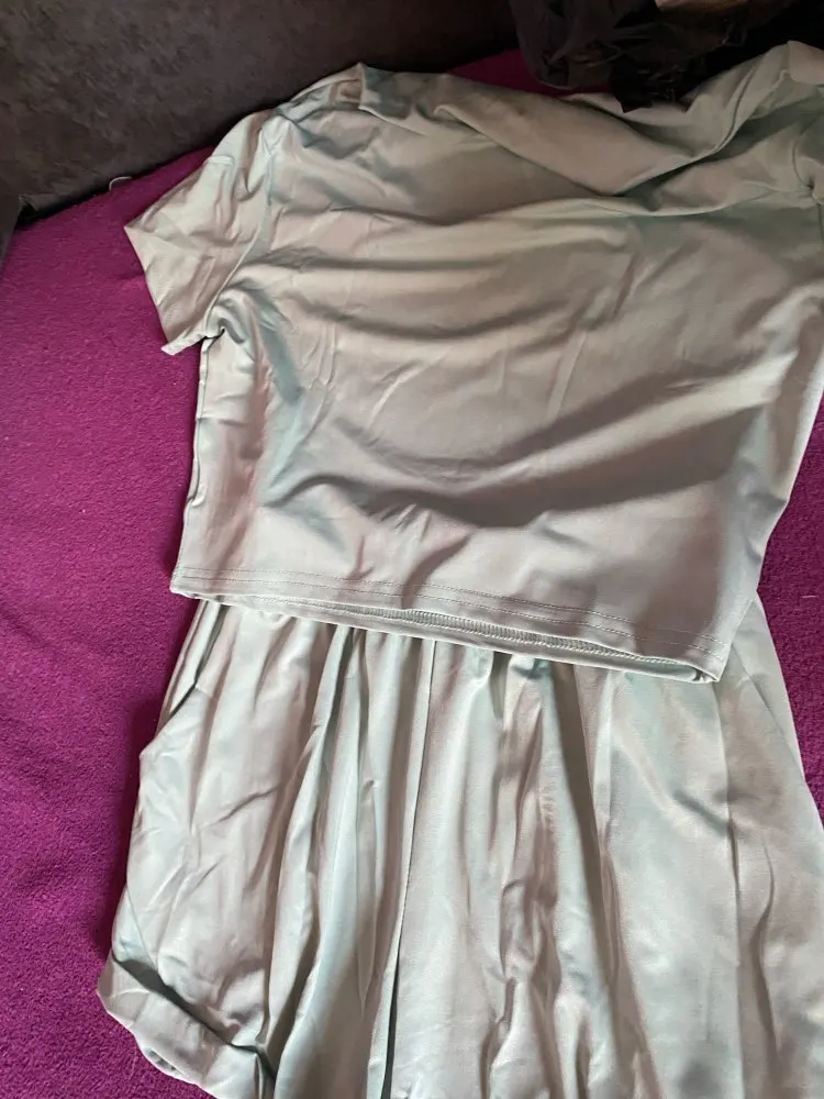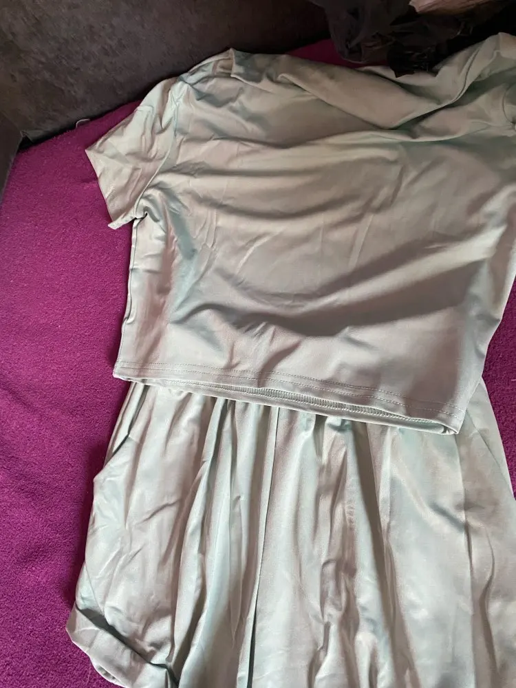 Не выглядит так, как на фотографиях, топ действительно маленький и шорты непропорционально большие. Топ выглядит странным вокруг шеи, качество ткани действительно плохое.