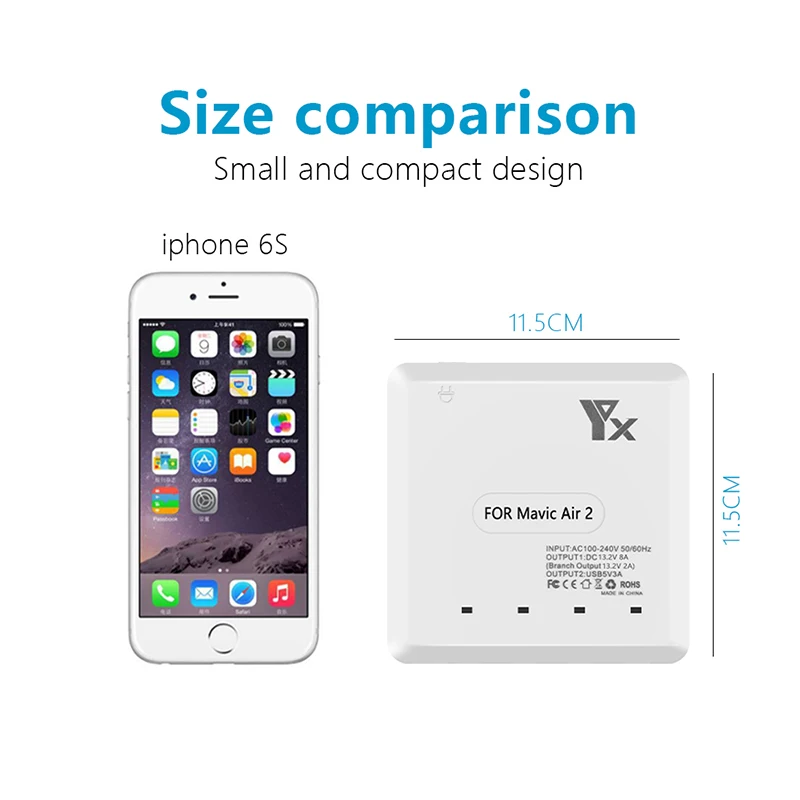 Комплект 1: вилка стандарта США Стандарт 2: вилка европейского стандарта Комплект 3: вилка стандарта Австралии Комплект 4: вилка стандарта Великобритании Описание: Название позиции: быстрое зарядное устройство для пульта дистанционного управления аккумуляторами DJI Mavic Air 2 Вход: 100-240 В переменного тока, Гц Выход: постоянный ток 13,2 В, 8 А (один порт 13,2 В, 2 а) USB: два порта, 5 В, 3 А Время зарядки: около 110 минут (полностью заряженные батареи 1-4) Количество портов: 4 порта для аккумулятора/2 порта USB. Вес продукта: 492 г (вилка для США), 499 г (вилка для ЕС), 543 г (вилка для Великобритании), 517 г (вилка для Австралии) Размер: 11,5*11,5*3,2 см Цвет: белый Особенности: 1. Мини-размер. Легко носить с собой. 2. Вы можете заряжать четыре батареи, один пульт дистанционного управления и один пульт одновременно 3. Быстро заряжайте аккумуляторы. Полная зарядка 4 батарей около 110 минут. 4. Умный контроль температуры, при повышении температуры вентилятор ускорится; 5. Позолоченные зарядные порты обеспечивают длительный срок службы. 6. Безопасность в использовании: защита от заряженности, защита от перегрева, защита от перегрузки по току, защита от перенапряжения, защита от короткого замыкания. Упаковочный лист: 1 зарядное устройство 1 * домашнее зарядное устройство 4 * кабели питания аккумулятора 1 * Инструкция (Зарядная линия USB в комплект не входит) (Батарея, контроллер и мобильный телефон в комплект не входят) Советы: 1. Используйте интеллектуальную летную батарею Air 2. После первоначального использования или длительного хранения перед использованием его следует полностью зарядить. Как правило, зарядка и разрядка повторяются в течение 3-5 циклов для восстановления емкости аккумулятора. 2. В нижней части зарядного устройства находится радиатор. Во время зарядки нагревается, это нормально. 3. Его следует заряжать и хранить в проветриваемом и сухом месте; Избегайте использования в местах с сильным магнитом или ограниченным использованием.