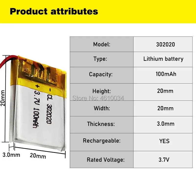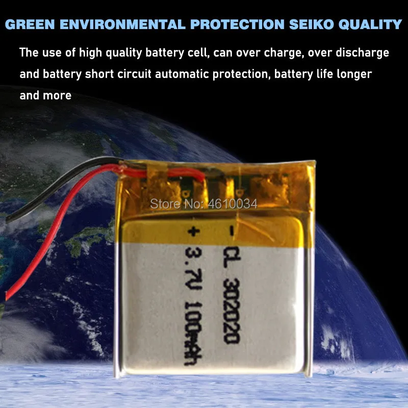 Аккумулятор 3,7 в, 100 мА ч, 302020, литий-полимерный, литий-ионный, для тахографа динамик для игрушек, MP3, MP4, GPS, Bluetooth, Lipo cell