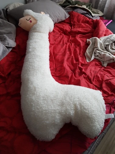 Плюшевая мягкая, теперь не возможно представить себе жизнь без это ламы, подушка просто обалденная. Поднимает спину. Сладко спится.