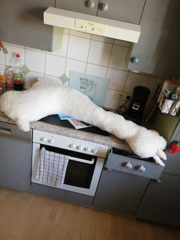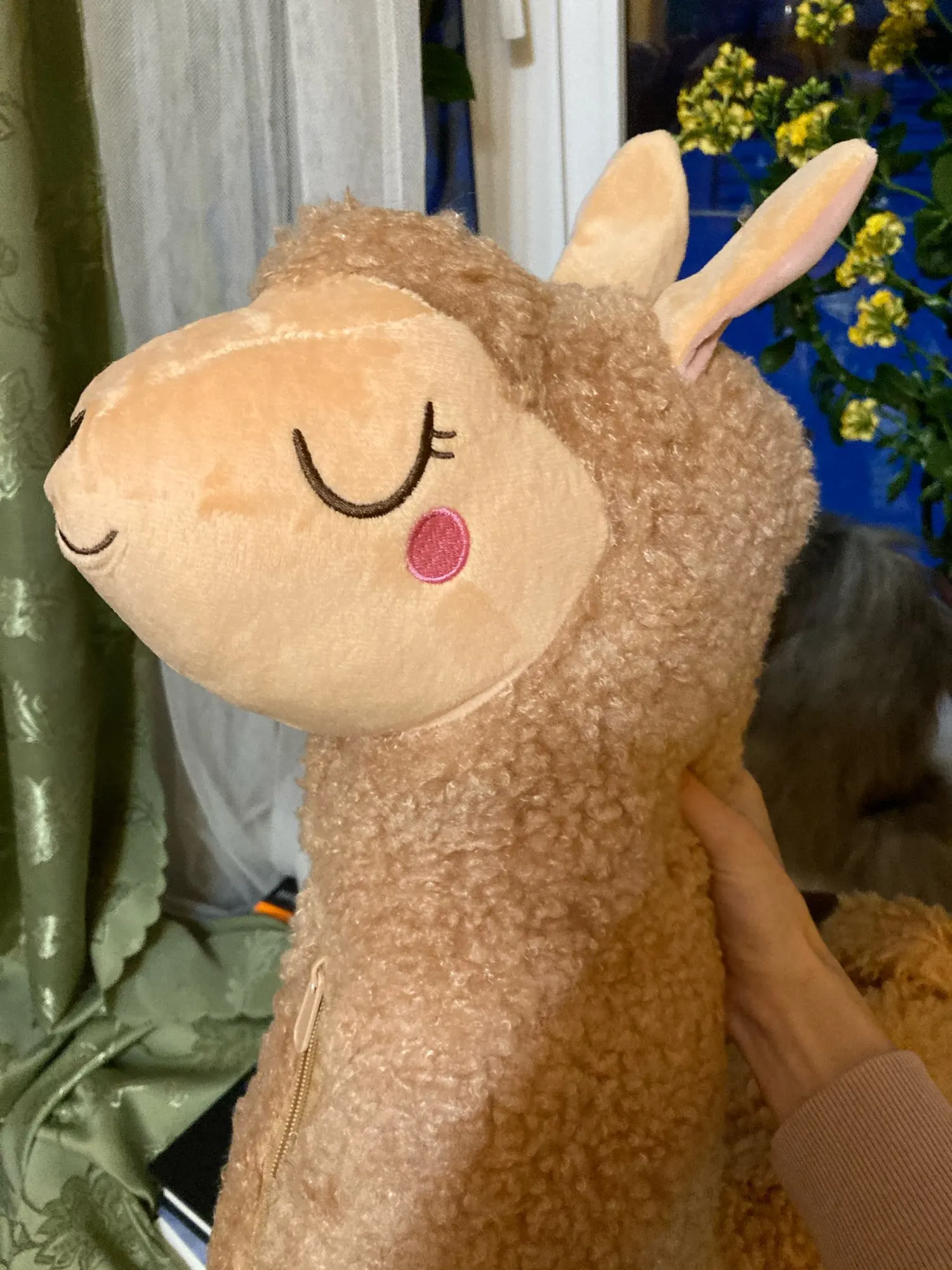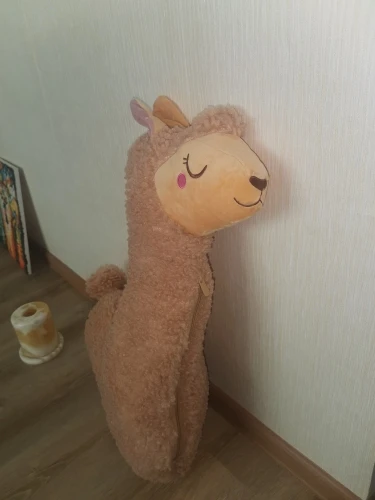 большая, мягкая и самое главное то, что внутри начинка находится в неком мешке, так что если ламу захотите помыть, то с нее достаточно шкуру снять и все