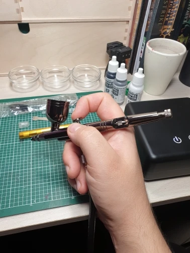 Компрессор хороший, фигачит без пульсаци, спокойно позволяет красить 30 минут, потом нагревается. За свои деньги просто отличный. Аэрограф так себе, он как бы и стоит около 1к. Но научиться самое то. Очень плохо контролируется подача краски, и чистить его не особо приятно, весь в китайских заусенцах, поэтому я просто заливаю его спиртом и похер на прокладки.