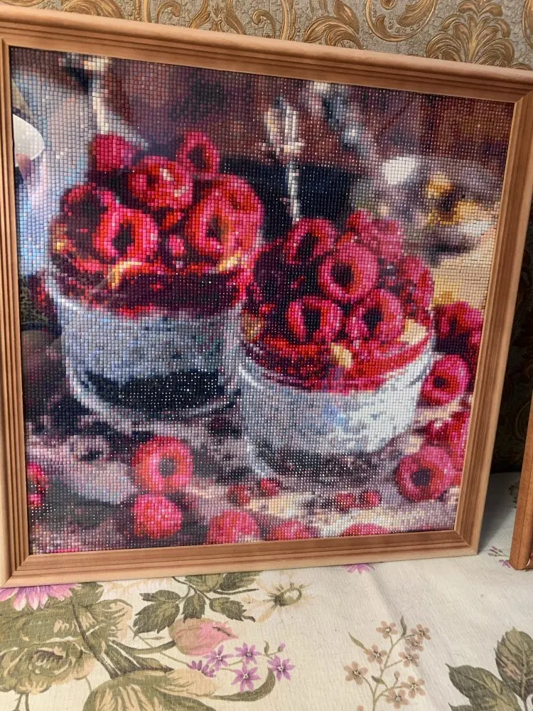 Выкладка полная,цветов достаточно,картина надета на валик,аккуратно запакована,рекомендую