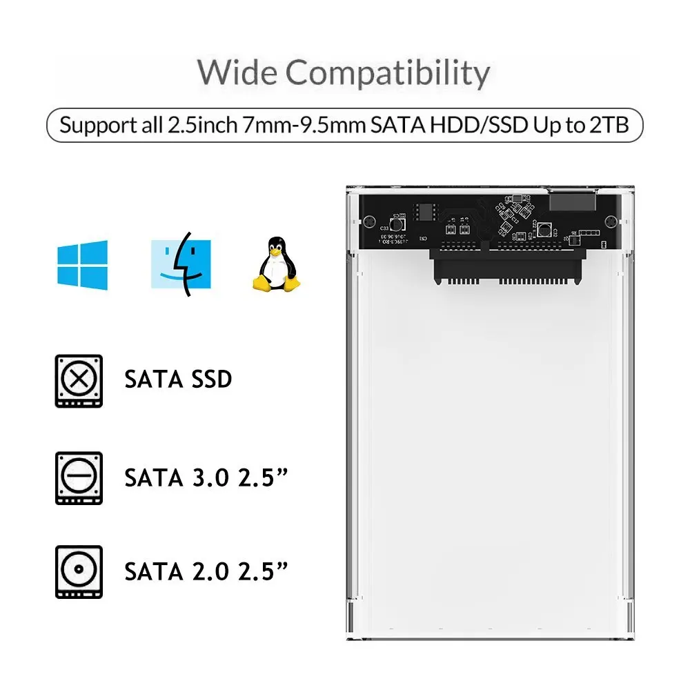 ПараметрыUSB 3,0 выходной интерфейсПоддержка 2,5 "дюймовый жесткий дискПоддерживает 2 ТБ 2,5 "жестких дисковАбс высокопрочный материал, высокая термостойкость, прочный Параметры продуктаБренд: ELUTENGСовместимые HDD Тип: 2,5 дюймов HDD / SSDВыход: USB 3,0 Micro B (обратная совместимость с USB 2,0 или 1,1)Ёмкость: 2 ТБСовместимость: ПК и MacКонтроллер: JMS578Размер: 124,5x79x13 ммТолщина: 13 ммЦвет: прозрачный инновационный дизайнМатериал: изготовлен из высокопрочного огнеупорного материала ABSДрайвер: драйвер не нуженПоддерживаемая система: Mac OS 9,1 или выше, Windows 10 / 8 / 7 / 2000 / XP. Linux и многое другое Особенности1. Доступный порт USB 3,0 на компьютере для достижения полной скорости передачи 5 Гбит/с2. Доступный порт USB 2,0 на компьютере для достижения полной скорости передачи 480 Мбит/с3. Горячая замена, подключи и работай, никаких драйверов не требуется4. Прозрачный инновационный дизайн5. Ультратонкий, портативный6. Широкая совместимость и сильное расширение7. Перегрузки по току, перенапряжения, перегрева, электрической утечки, короткого замыкания и предотвращения беспорядка Посылка содержание2,5 "жесткого диска SATA * 1SATA для подключения к USB и кабель питания * 1 Примечание:Производительность передачи USB 3,0 будет отличаться от производительности компьютера, операционной системы, жесткого диска.Поддержка 2,5 дюймов жесткого диска, не Поддержка 3,5 дюймов