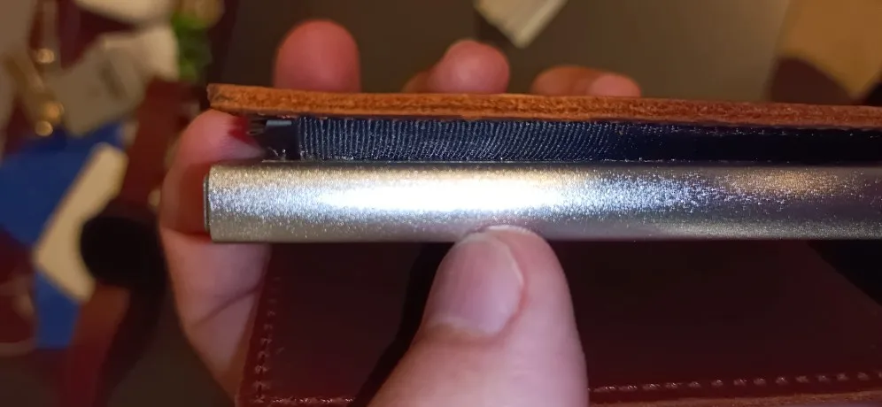 Очень хороший продукт... настоящая кожа действительно, просто необычный запах кожи, который, я надеюсь, скоро исчезнет :). Надеюсь, что склеенное соединение между кожаным и алюминиевым держателем остается прочным.