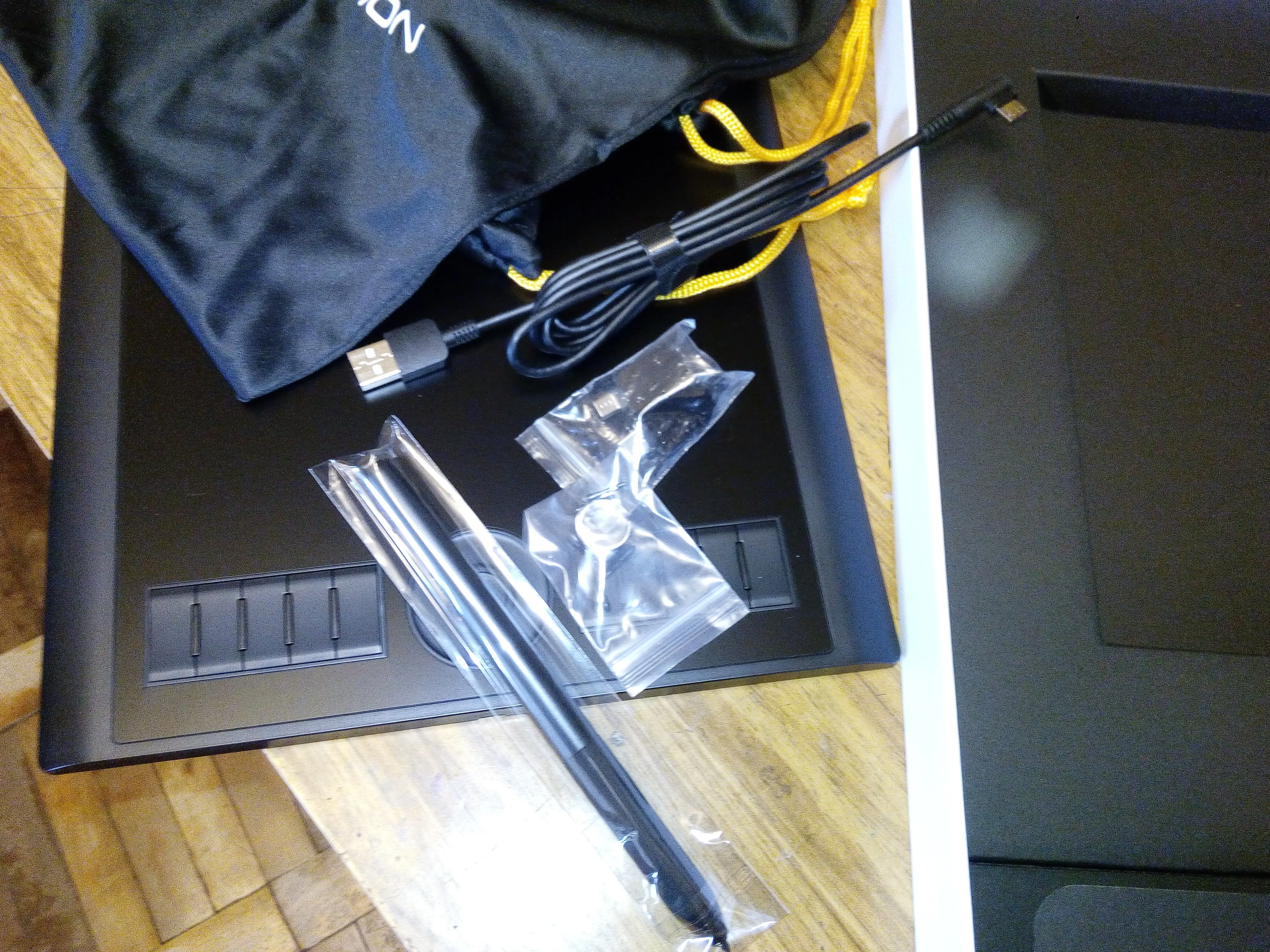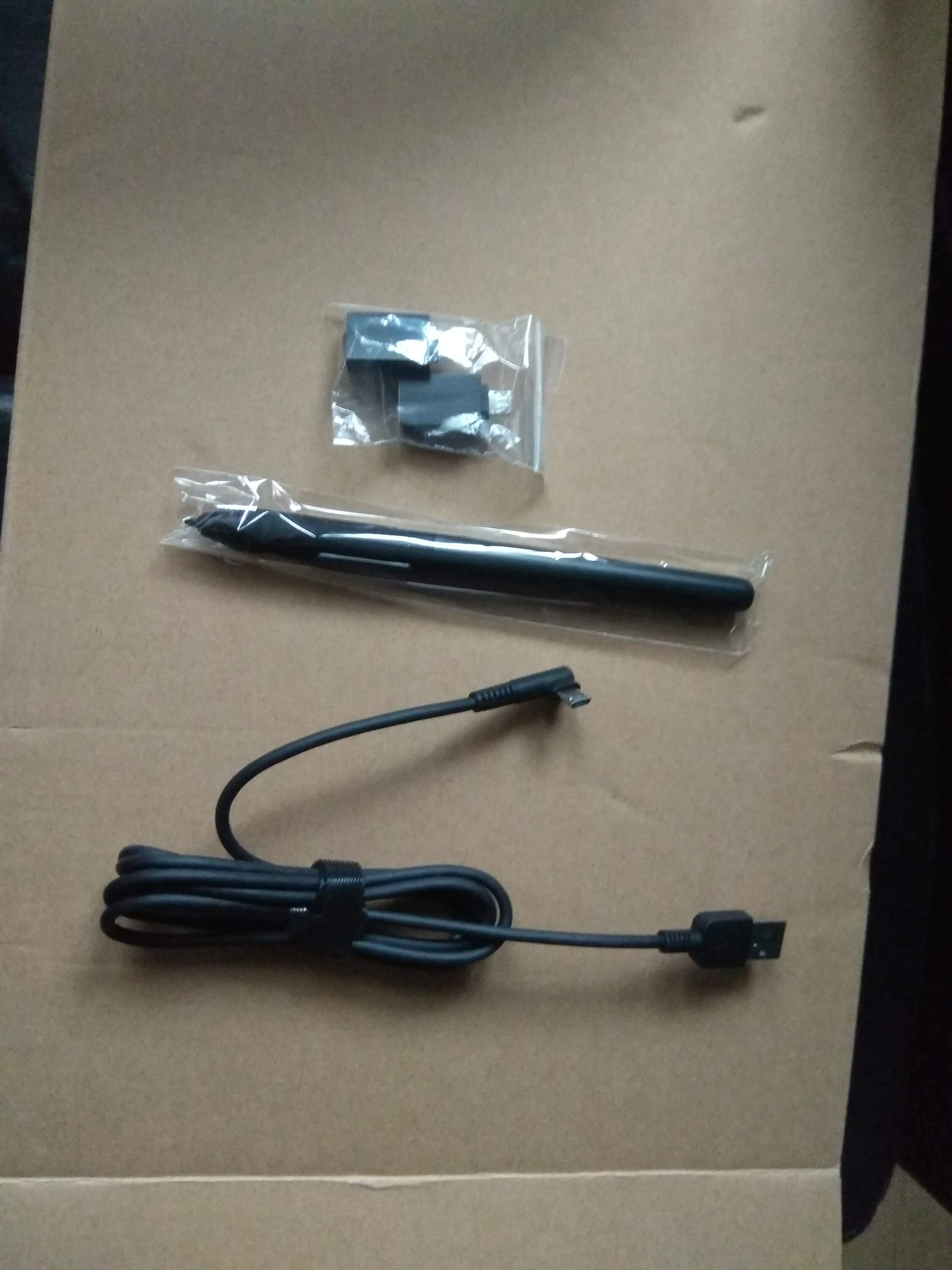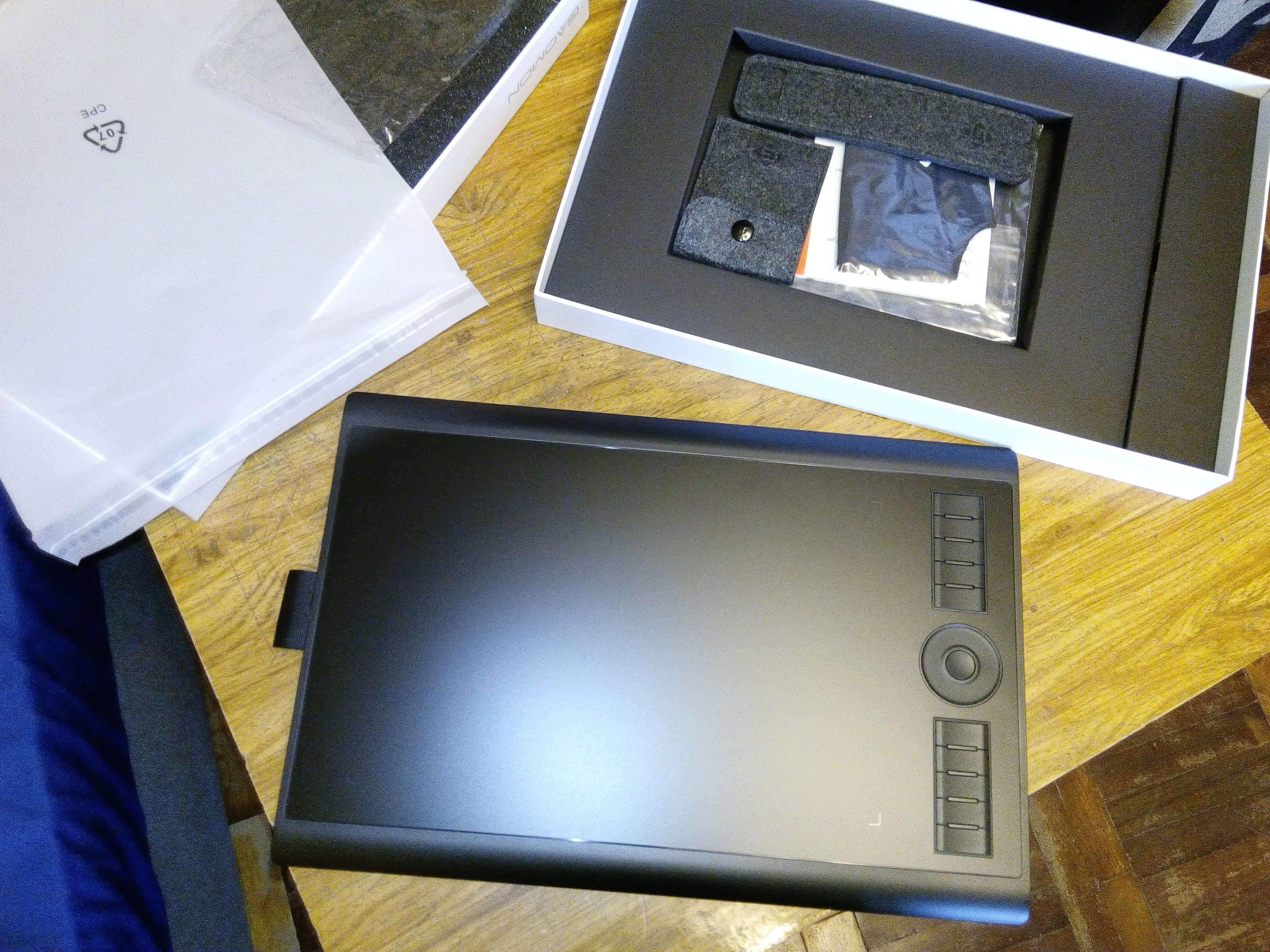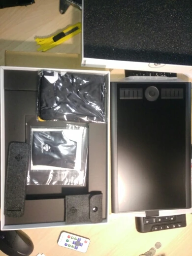 Посылку доставили быстро. Комплектация: планшет,краткое руководство, ручка с запасными перьями, USB переходники с шнуром, перчатка, чехол для планшета. Протестировал планшет в фотошопе. Работает хорошо. Рекомендую.