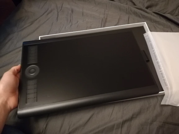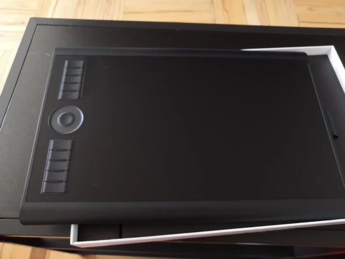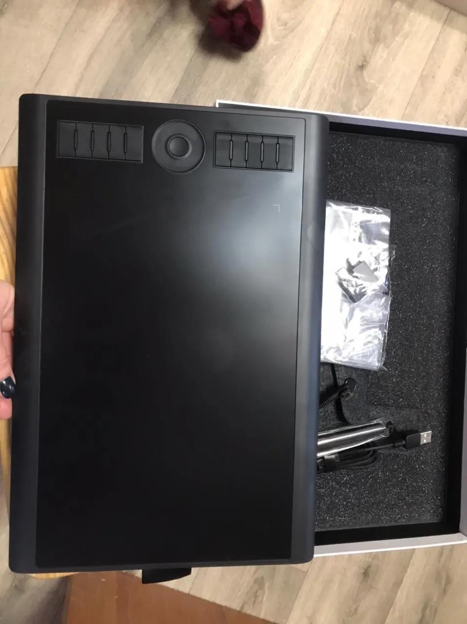 Первый раз заказывала большой граф. планшет и видимо мне повезло, так как он оказался очень удобный. Если на маленьком планшете рисование было скорее преодолением неудобства планшета, то сейчас я иногда забываю, что под рукой у меня он. Стилус хорошо реагирует на легкие нажатия, курсор появляется даже когда просто водишь стилусом над ним. Кнопки на планше не ощущаются дешёвыми; и в целом кажется довольно качественный. Может это только моя проблема, но вход для провода немного неудобен и я не могу воткнуть правильно провод с первого раза (мне вообще кажется что лучше провод держать на постоянке в нём, вход будто бы легко сломать). А ещё это выглядит вот так (4), неудобно чутка сделано. В коробке была всякая прикольная нужная фигня, в остальных отзывах об этом уже написано. Доставили за неделю в Крск.