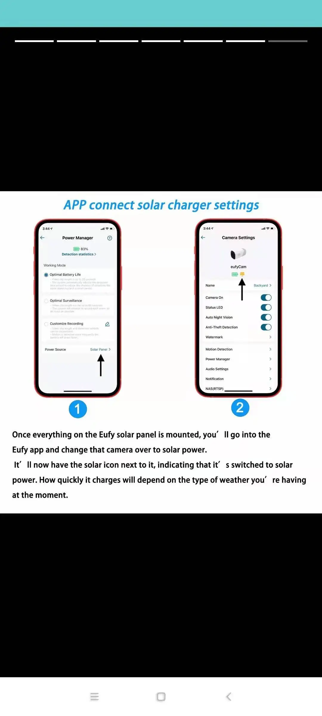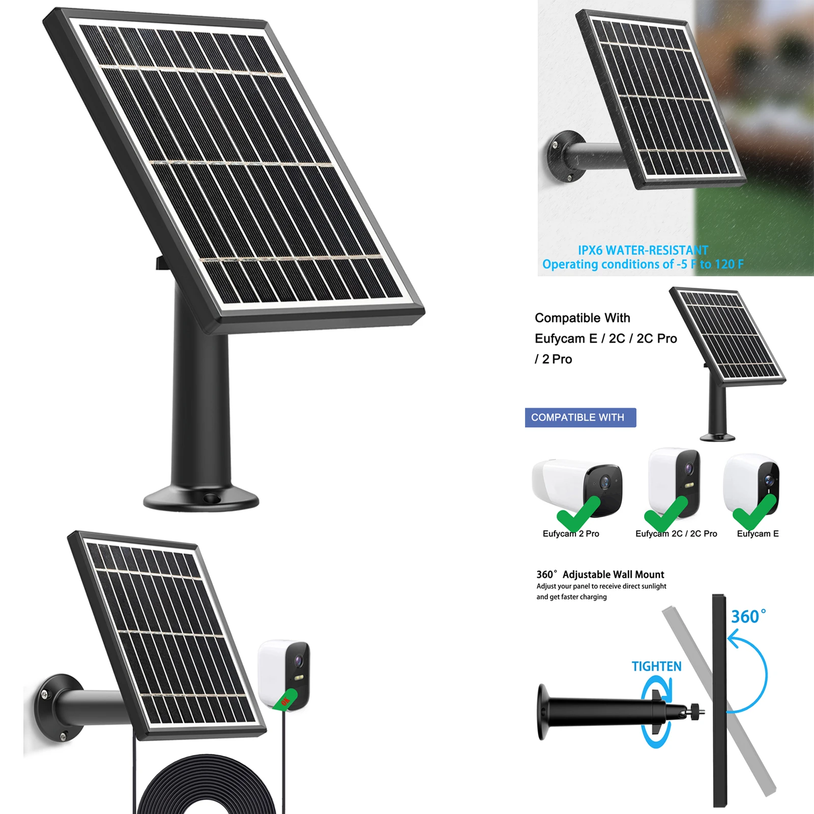 Примечание: Когда вы подключаете солнечные панели к своим камерам, вам нужно перейти в приложение Eufy, а затем перейти к настройкам камеры. В опции Power Manager измените настройки от Power до Solar. В противном случае зарядное устройство не будет работать должным образом. Хотя вы не увидите значок зарядки аккумулятора, но вы должны увидеть значок солнечной панели рядом с уровнем зарядки. Обратите внимание на номер и проверьте его снова через несколько часов, чтобы увидеть, что он увеличен.Зарядка ваших устройств: солнечная панель для eufyCam E eufyCam 2C eufyCam 2C Pro eufyCam 2 Pro SoloCam E20 E40, несколько часов прямого солнечного света каждый день будет держать вашу камеру eufyCam заряженной круглосуточно; больше никаких изменений батареи, больше нет необходимости в адаптере питания.Погодостойкая солнечная панель: сравните с другими поликристаллическими солнечными панелями на рынке. Наша монокристаллическая-Si панель имеет более высокую эффективность преобразования и выходную мощность. Он также имеет более длительный срок службы, и он более эффективен в теплую погоду. И он устойчив к атмосферным воздействиям, может отлично работать на открытом воздухе., условия эксплуатации от-5 °F до 120 °F (от-20 °C до 48 °C).Гибкая регулировка: надежная Монтажная Скоба может регулироваться в 360 градусов, чтобы запечатлеть солнечный свет в разные сезоны; Непрерывная мощность вашего eufyCam в максимальной эффективности.Упаковочный лист: 1 x солнечная панель, 1x360 ° безопасный кронштейн, 1x4,0 м/13,1 фута кабель, 3 x винты; Примечание: Этот продукт не является продуктом eufyCam, указанный выше бренд и модель предназначены только для демонстрации совместимости; Если вы 110% не удовлетворены, Мы предлагаем полный возврат. Обещаем гарантию 12 месяцев плюс 30 дневную гарантию возврата денег. Если у вас возникнут вопросы, пожалуйста, не стесняйтесь задать их по электронной почте, и на ваши вопросы будет дан ответ в течение 12 часов. -Без хлопот, просто люблю(Камера в комплект не входит)