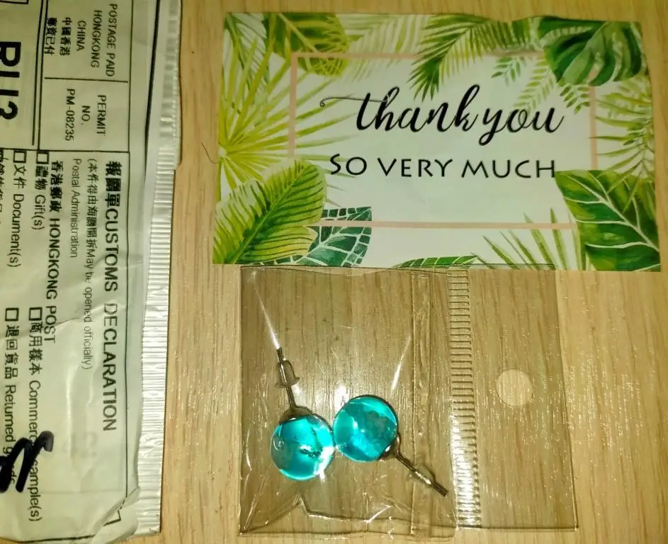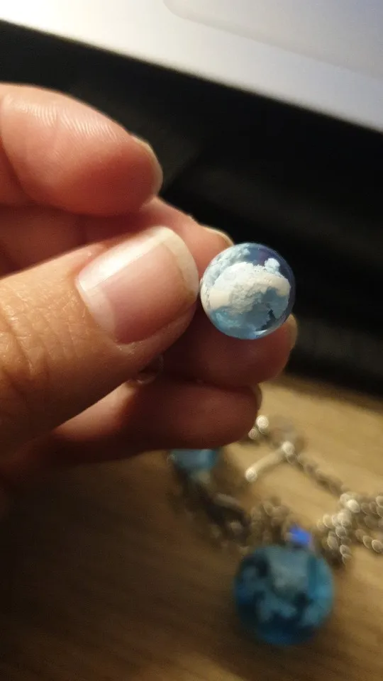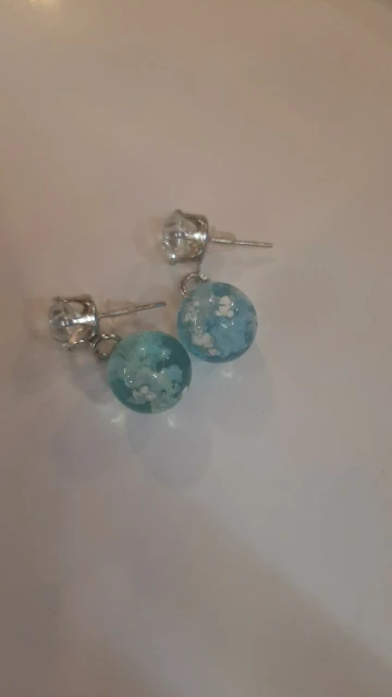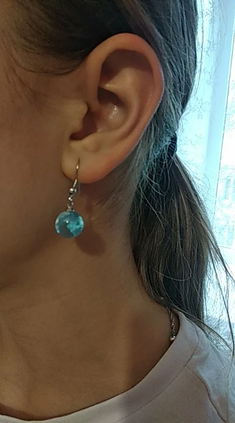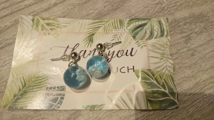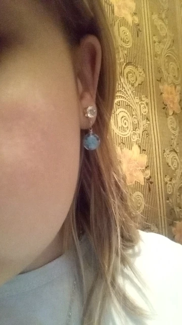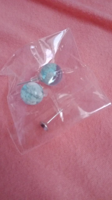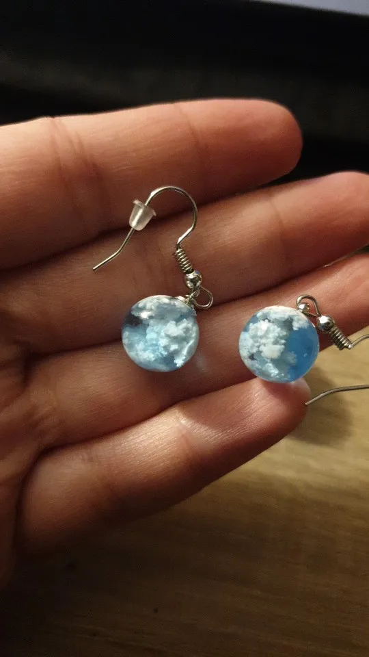 Эти серьги в порядке, но на самом деле они выглядят не так хорошо, как на фото. Даже моя фотография стала хорошей, но мои глаза видели белый пластик в смолы, а не облака в небе :) однако они все еще в порядке. Заказ доставляется в течение 17 дней, очень быстро