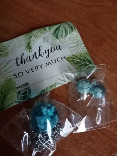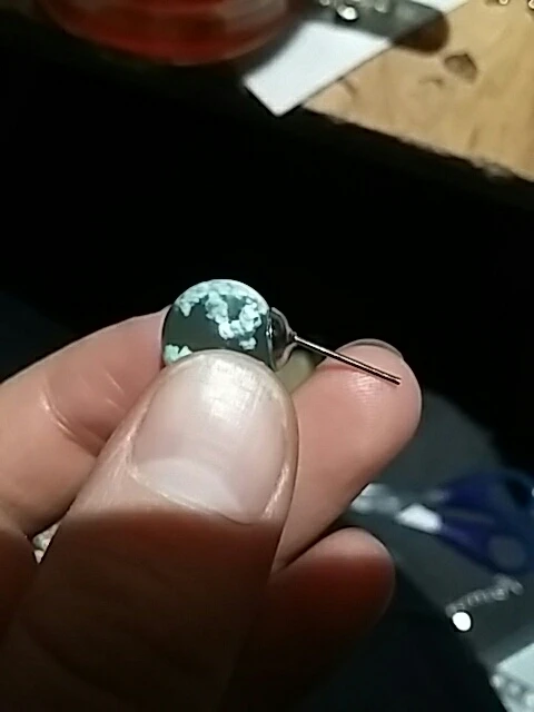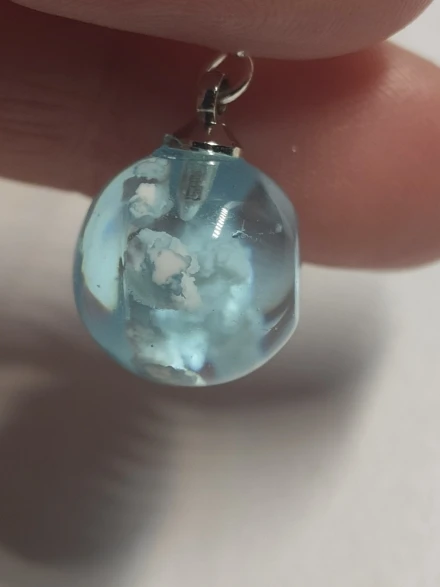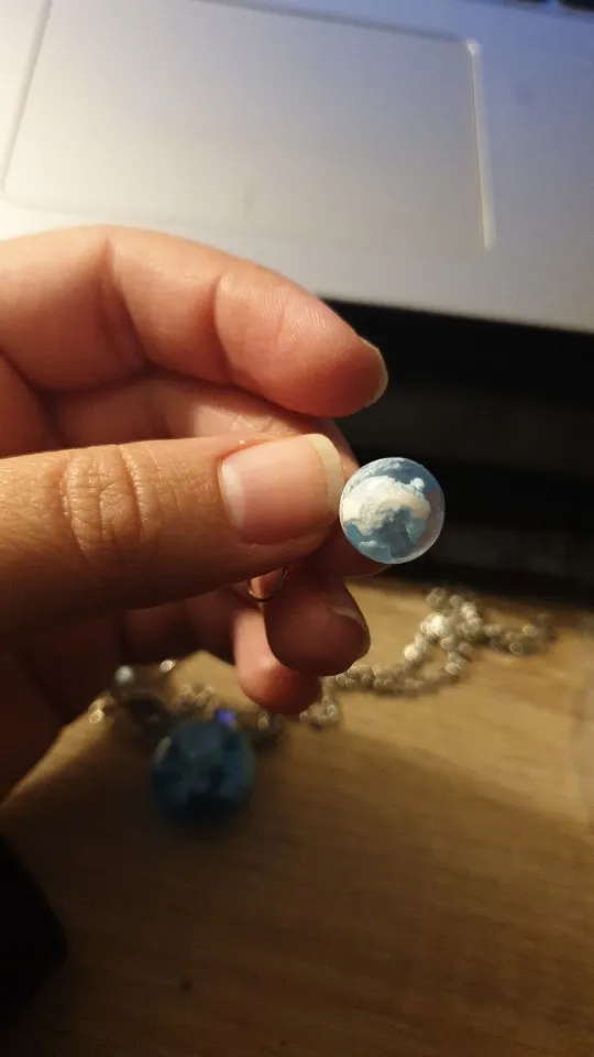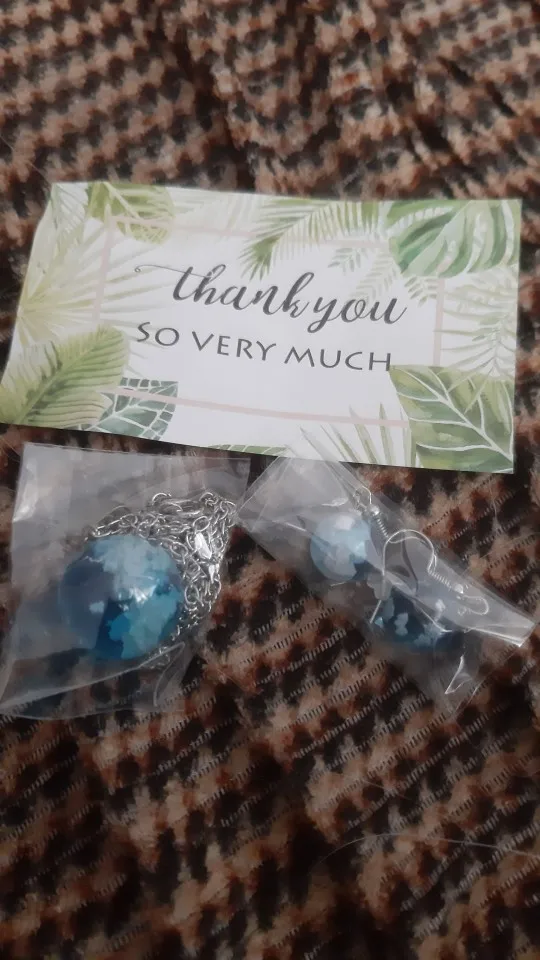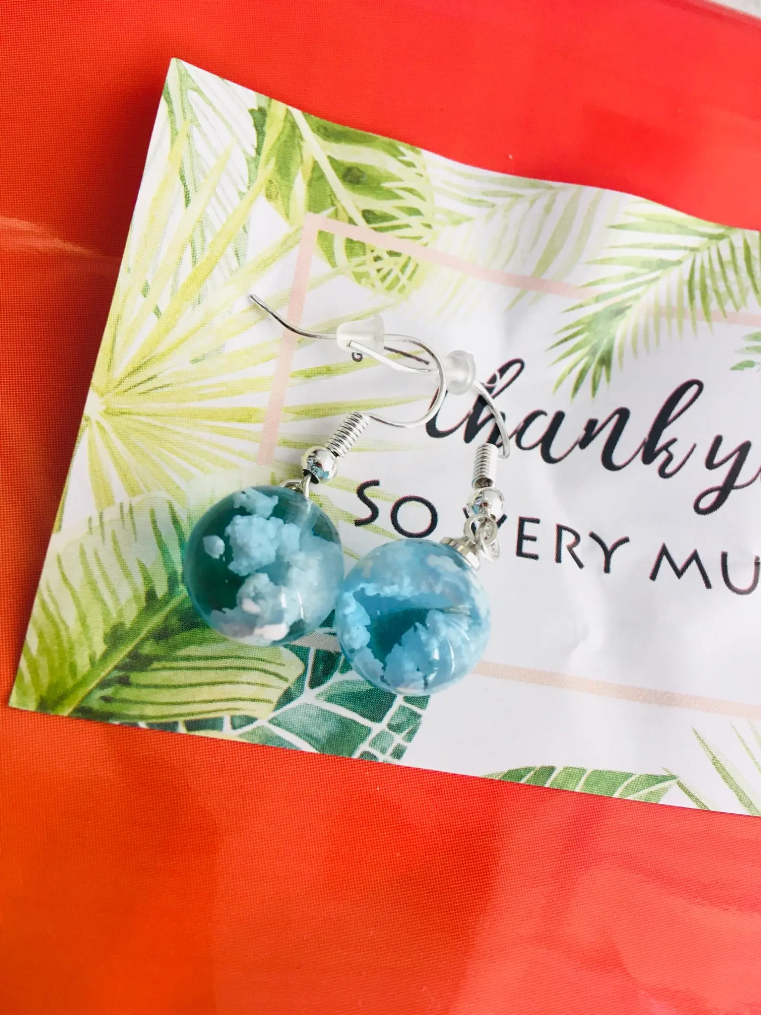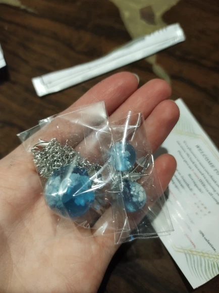 Эти серьги в порядке, но на самом деле они выглядят не так хорошо, как на фото. Даже моя фотография стала хорошей, но мои глаза видели белый пластик в смолы, а не облака в небе :) однако они все еще в порядке. Заказ доставляется в течение 17 дней, очень быстро