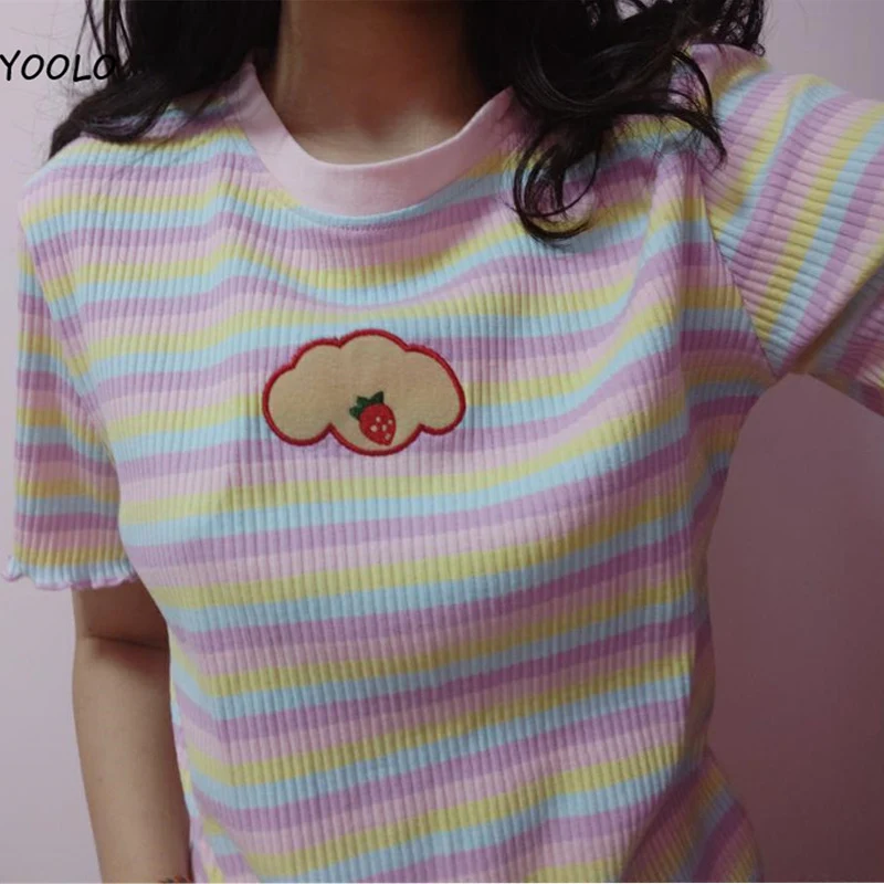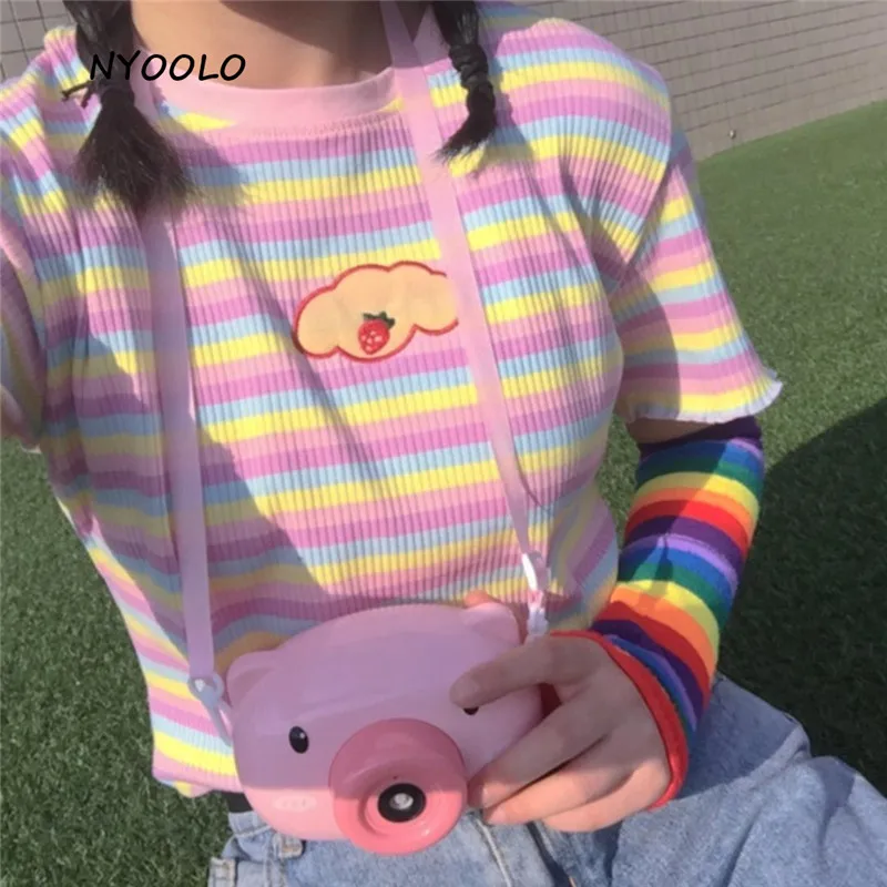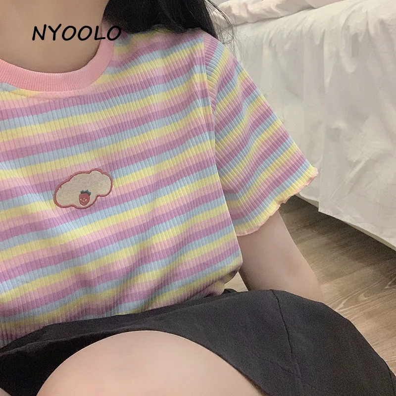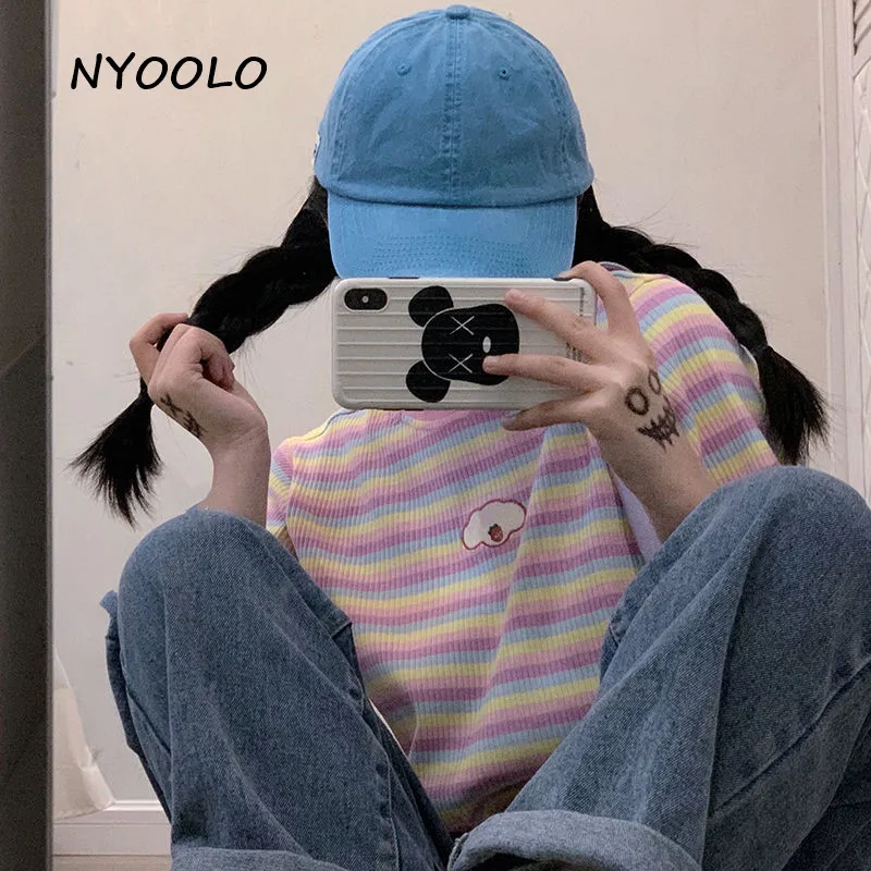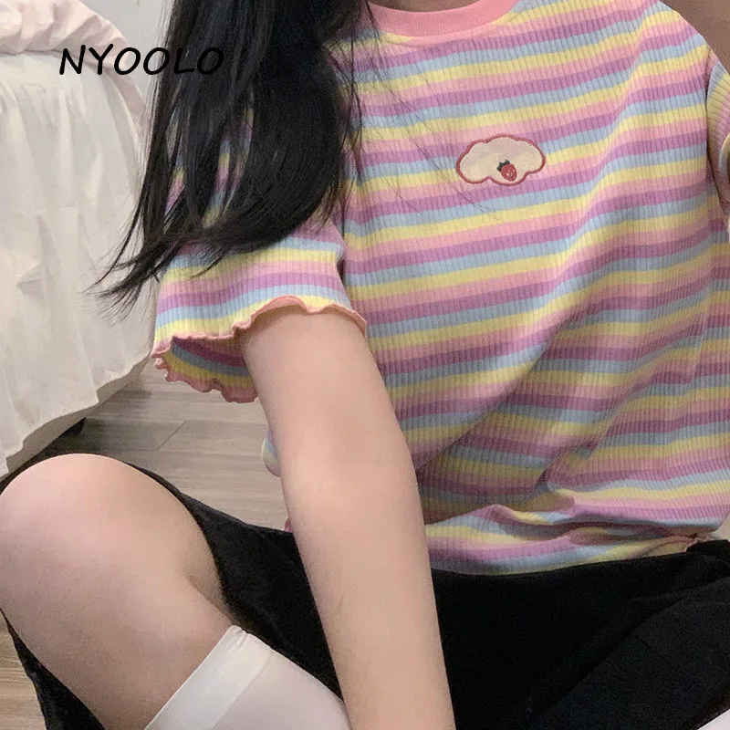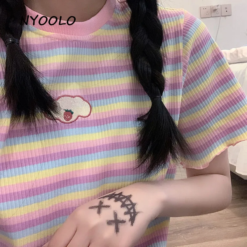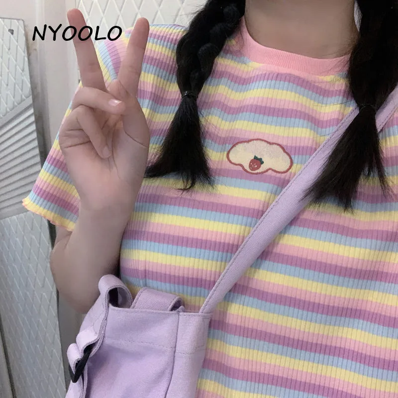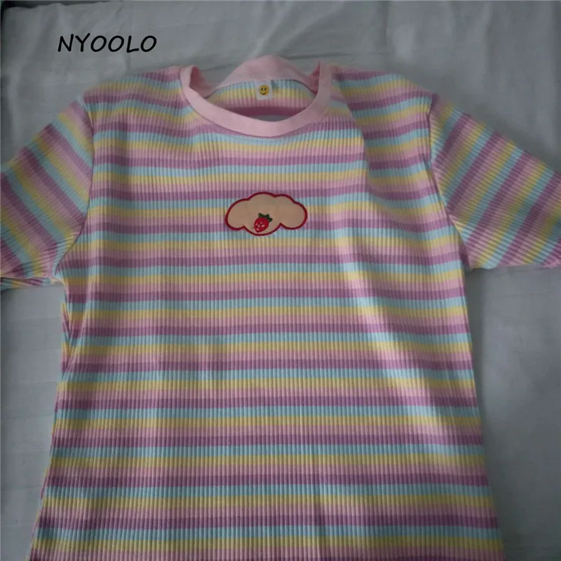 Женская футболка NYOOLO, с вышивкой клубники, в радужную полоску, с коротким рукавом, лето 2020