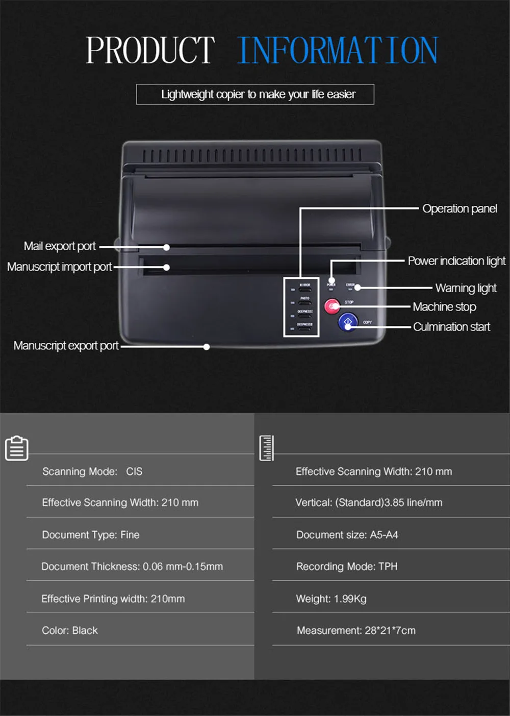 Тип товара: Переносная МашинаМатериал: АБС-пластикРежим СКАНИРОВАНИЯ: CISСканирование Разрешение: по горизонтали: 8dot/мм, по вертикали: 7,7 производственная линия/Оборудование для ммЭффективная ширина сканирования: прибл. 210 мм/8,3 дюймаТип документа: тонкий/фотоРазмер документа: A5-A4Толщина документа: прибл. 0,06 мм-0,15 ммРежим записи: TPHЭффективная ширина печати: прибл. 210 мм/8,3 дюймаМощность: 110 В-220 В переменного токаПотребляемая мощность: в режиме ожидания 5 ВтЧастота: 50 Гц/0.46AРабочая температура: 5 ℃-35 ℃Относительная влажность: 20%-80%Цвет: черный, серебристыйРазмер: прибл. 28*17*7 см/11,0*6,7*2,8 дюймовВес: около 170 г/60 унцийФункция: переводная печать для обычной тату-бумагиУпаковка:1 x трансферная машина1 х руководство на английском языке1 х шнур питания